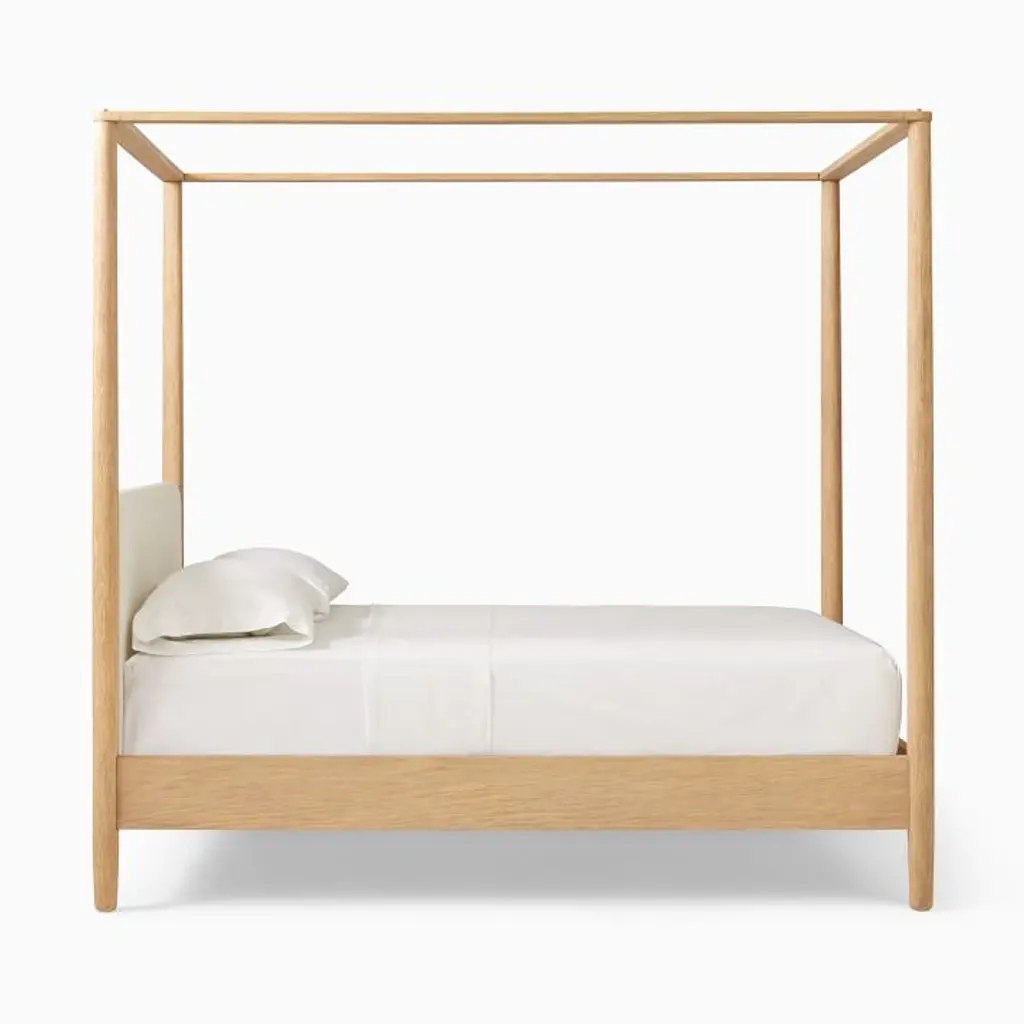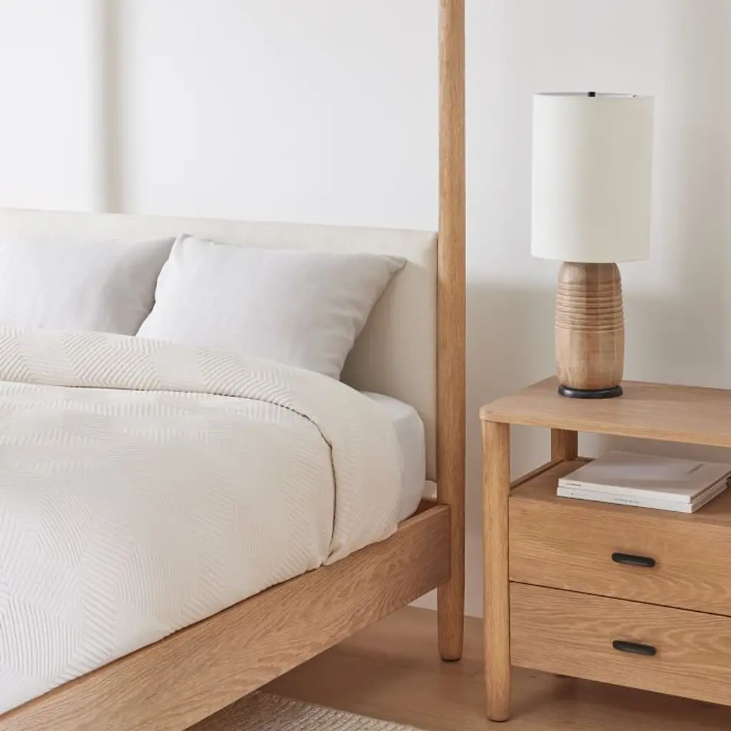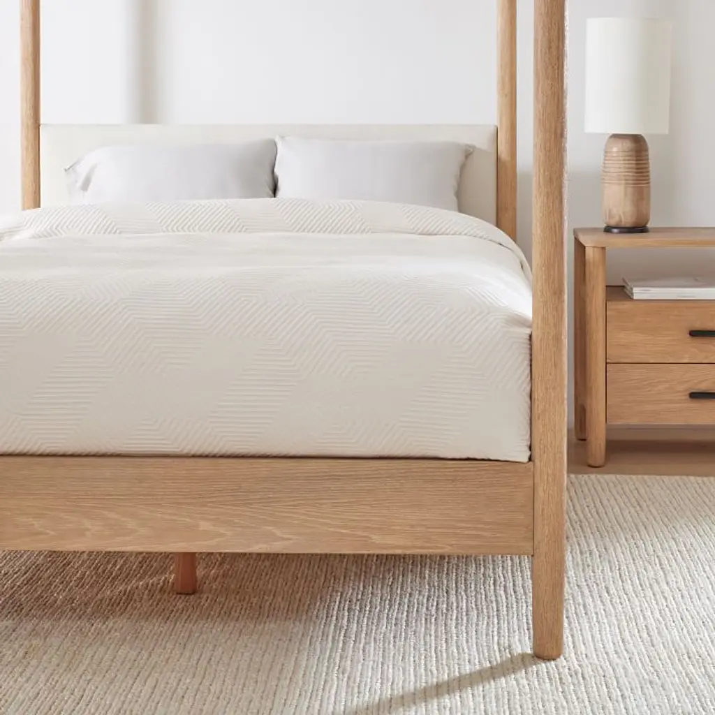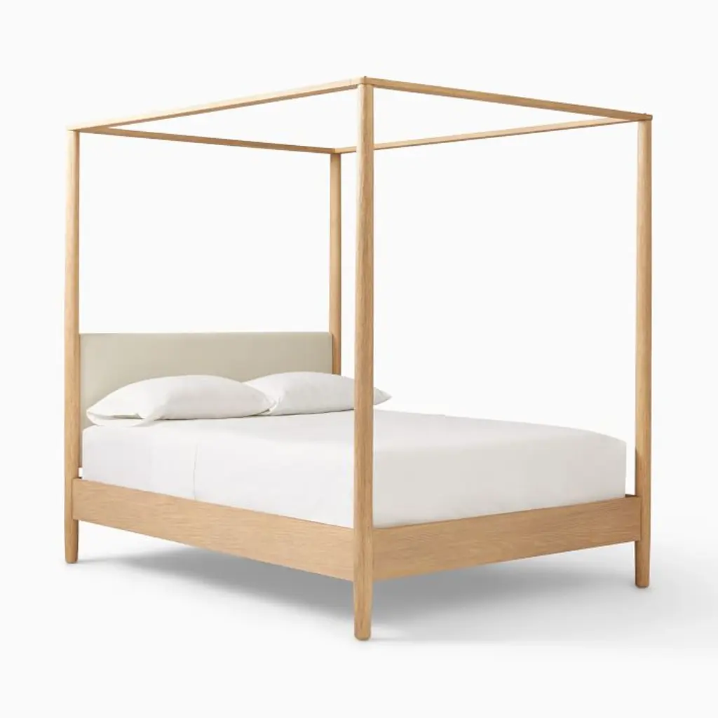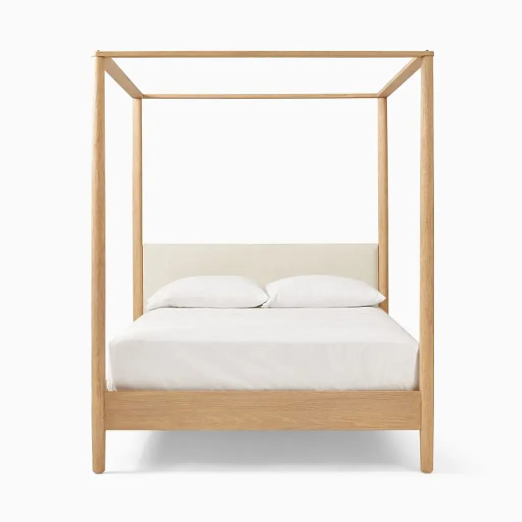 Solid mahogany veneer over engineered wood frame. Solid mahogany wood legs. Covered in a water-based Dune finish. All wood is kiln-dried for added durability. Made with FSC®-certified wood from responsibly managed forests. Headboard upholstered in Yarn-Dyed Linen Weave in Alabaster. Solid wood slats included. Accommodates most standard mattresses; box spring optional. This contract-grade item is manufactured to meet the demands of commercial use in addition to residential. See more. Made in Indonesia.