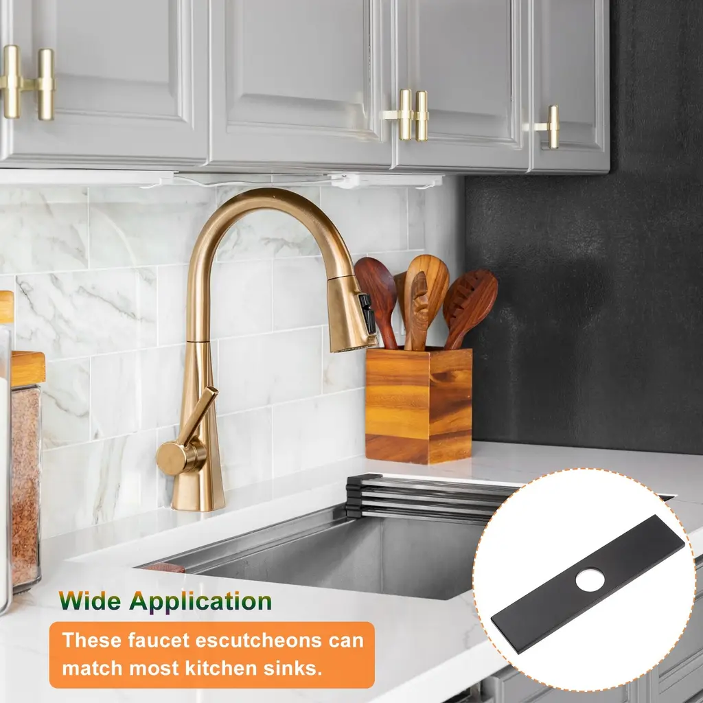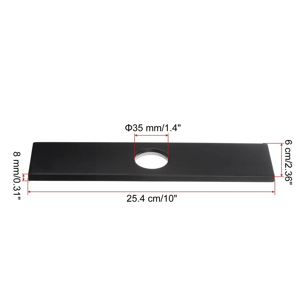 Advantage:The hole cover plate is made of stainless steel, with surface treatment, resistant to scratches, corrosion, and tarnishing.Designed with a thick white foam pad under the case can effectively prevent water from leaking through the sink hole.The hole cover allows a single-hole faucet to be installed on 3 3-hole sinks and covers the unused outer holes of the bathroom sink.Just put the cover plate under the faucet, then tighten the faucet, It can be cleaned only with a soft cloth, saving you time.Keep your kitchen faucet clean and tidy, sink hole cover can match most sinks, such as stainless steel/ceramic kitchen sink, and bathroom sink.Specification:Material: Stainless steelColor: BlackSize: 25.4 cm x 6 cm/10 inch x 2.36 inch(L*W)Thickness: 8 mm/0.31 inchHole Diameter: 35 mm/1.4 inchPackage Included: 1pcs x faucet cover plate