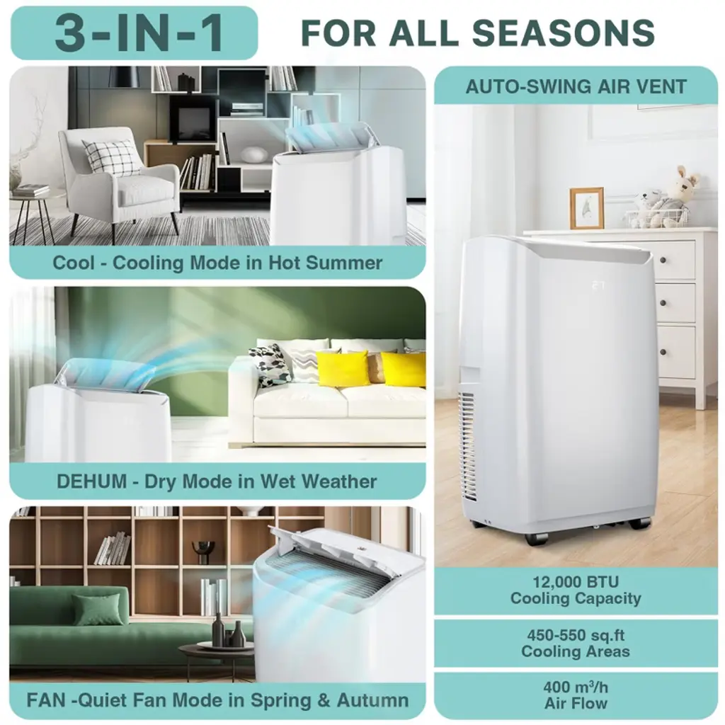 12000btu Portable Air Conditioner, 3-in-1 Cooling/dehumidifying/fresh Air Modes, 550 Sq. Ft Coverage, 51db Quiet Sleep Mode