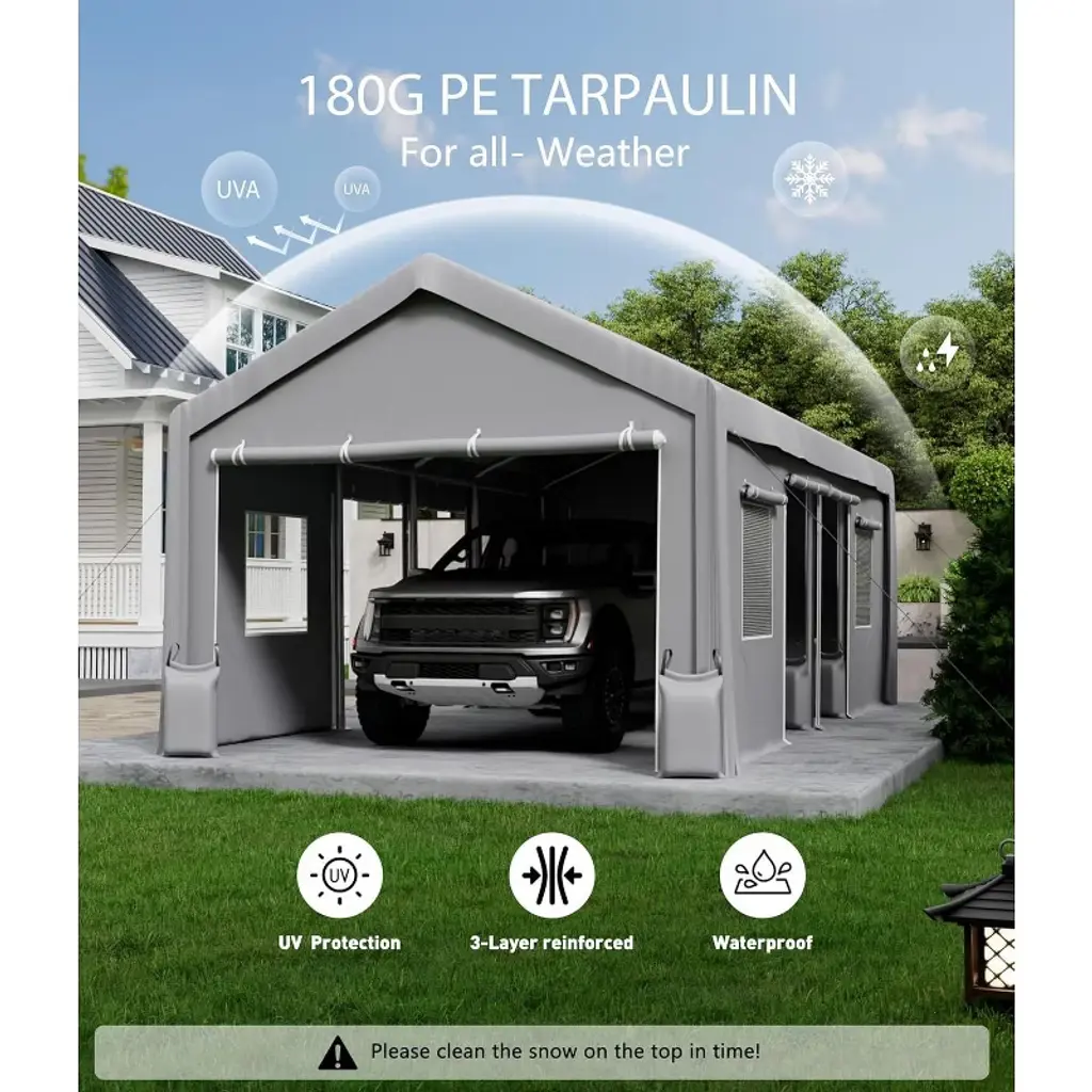 This Carport Tarp offers vehicle protection in a variety of sizes, designed to provide 360° coverage for full-size trucks, bass boats, and SUVs. An additional 1-foot height clearance compared to standard tarps prevents damage to roof antennas/rudders, while the 10-foot widening accommodates parking spaces or workshop setups.This tarp features a triple-layer PE laminate with UV50+ treatment to block 99% of harmful rays while withstanding snow loads. Thermally bonded seams and double-stitched edges prevent tearing at stress points, and last 3 times longer than standard 150GSM covers. Includes 36 reinforced aluminum grommets (one every 18 inches) that effectively resist winds up to 55 mph when properly secured.