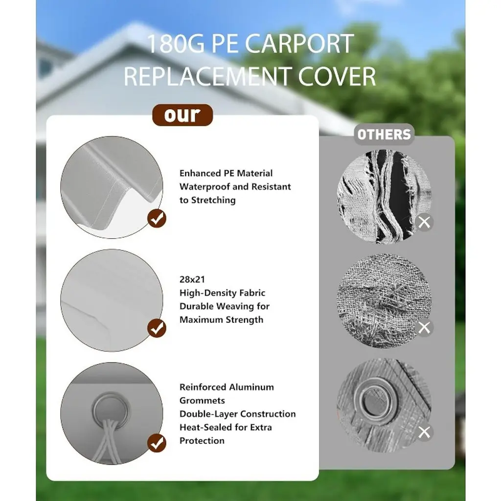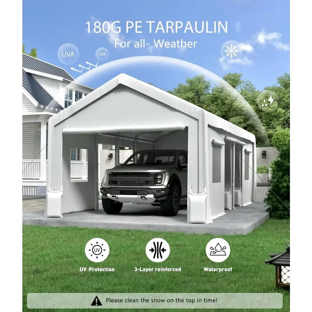 This Carport Tarp offers vehicle protection in a variety of sizes, designed to provide 360° coverage for full-size trucks, bass boats, and SUVs. An additional 1-foot height clearance compared to standard tarps prevents damage to roof antennas/rudders, while the 10-foot widening accommodates parking spaces or workshop setups.This tarp features a triple-layer PE laminate with UV50+ treatment to block 99% of harmful rays while withstanding snow loads. Thermally bonded seams and double-stitched edges prevent tearing at stress points, and last 3 times longer than standard 150GSM covers. Includes 36 reinforced aluminum grommets (one every 18 inches) that effectively resist winds up to 55 mph when properly secured.