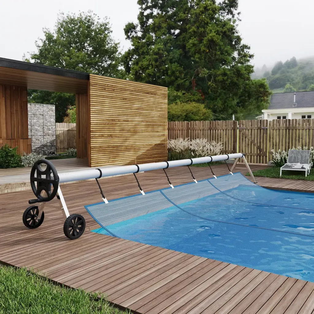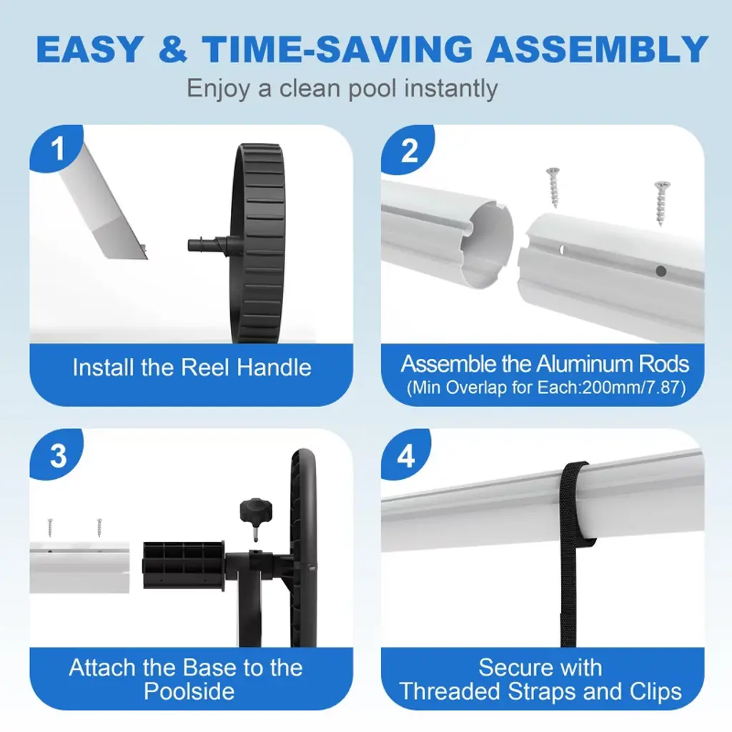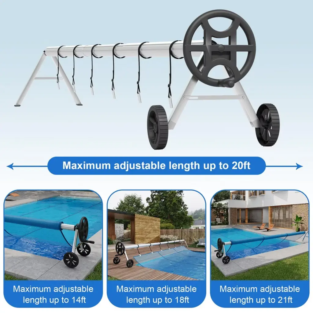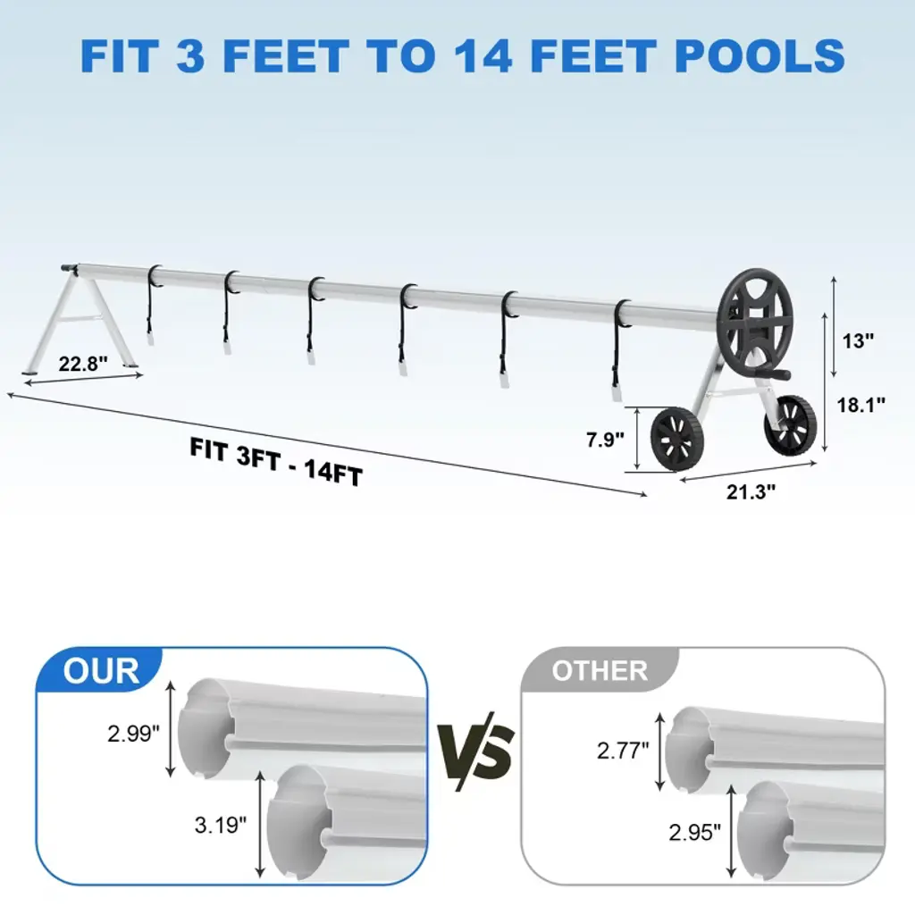 14FT Solar Cover Reel for Inground Pool, Automatic Roller with Tool-Free InstallationProduct Details:1. Pro-Grade Rust-Proof Aluminum ConstructionEngineered with a robust frame constructed from aircraft-grade 6063-T5 aluminum alloy, this reel provides exceptional strength to handle solar covers weighing up to 200 lbs. Unlike ordinary steel reels, it is completely immune to rust and corrosion from pool chemicals, ensuring a long-lasting and maintenance-free performance season after season.2. Ultra-Smooth Rolling with Industrial Bearing TechnologyTransform a tedious chore into an effortless task. The advanced system features double-sealed industrial bearings with an IP68 waterproof rating, reducing rolling resistance by a remarkable 70% compared to standard plastic bushings. Effortlessly roll up an 18-foot pool cover in about 30 seconds with minimal physical effort.3. Optimized Drum for Maximum Heat Retention & EfficiencyMaximize your pool's heating potential with a precision 3.5-inch diameter drum. This specialized design effectively prevents air bubble trapping and eliminates wrinkles, ensuring your solar cover remains perfectly flat. This allows for maximum sunlight absorption and can increase your pool water temperature by up to 15¡ãF, significantly extending your swimming season.4. Universal Tool-Free Setup in Under Five MinutesAchieve a professional installation in minutes, not hours. The reel comes with pre-drilled universal mounting brackets designed to fit all standard inground pool ledges. The entire assembly requires no drilling, welding, or special tools¡ªjust use the included T-handle wrench for a quick, secure, and hassle-free setup.5. All-Weather Durability with a 5-Year WarrantyBuilt to perform reliably in extreme conditions, from frigid -30¡ãF winters to intense 120¡ãF summer heat. Protective end caps shield the internal mechanisms from debris and moisture. Your investment is secured with a strong 5-year warranty against bending, warping, and corrosion, guaranteeing peace of mind and year-round durability.Specifications:Size: 14FTMaterial: Aircraft-Grade 6063-T5 AluminumColor: BlackProduct Dimensions: 47.24" L x 10.43" WMaximum Weight Capacity: 200 lbsDrum Diameter: 3.5 inchesBearing System: IP68 Rated Double-Sealed Industrial BearingsIncluded Components: Universal Mounting Brackets, T-Handle Wrench, Protective End CapsWarranty: 5-Year Limited Warranty