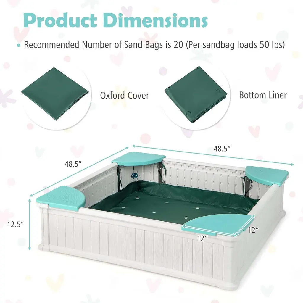 Turn your backyard into a rewarding playground with our kids sandbox. This HDPE sandpit has a ground liner included to control the sand depth. The reinforced structure is stable and reliable with a bottomless design to facilitate drainage and accelerate ventilation. Oxford cover is also included for the dual protection against bad elements, debris and wide animals. Features:Specification
