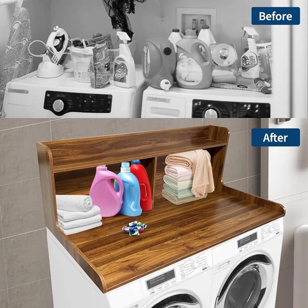2-tier Wood Laundry Countertop W/ Waterproof Cover, Anti-slip Pads & 2.75" Rails - Washer Dryer Organizer For Laundry Room