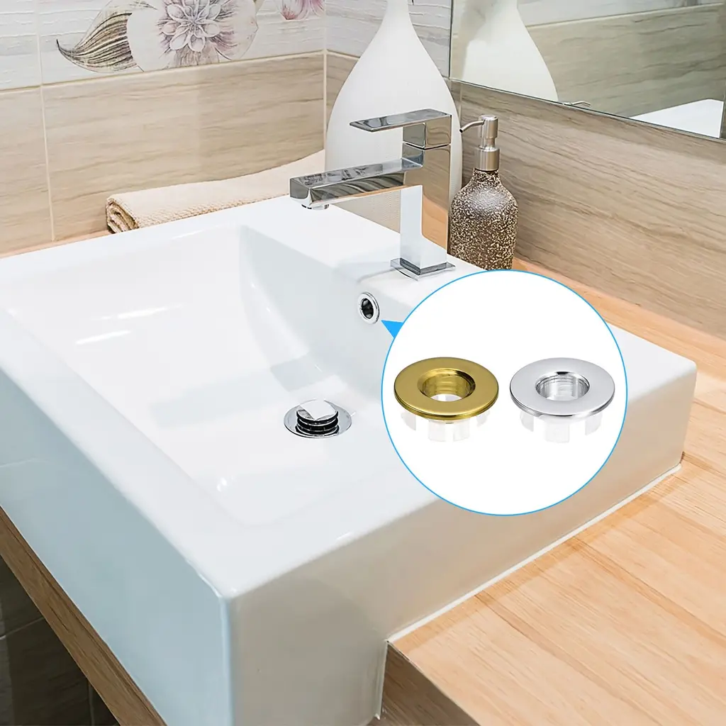Description:Made of ABS plastic and copper material that is sturdy and durable, has good wear and corrosion resistance. With an electroplate finish that ensures surface gloss and brightness, can be used for a long time without fading.The sink trim overflow covers look stylish and modern, can decorate the overflow hole but not clog it, and makes your sink look cleaner and tidy. Not easily fall off after installation and won't scratch the surface of the sink.Installation is quick and easy, before installing, measure the hole size, then simply push and snap into desired position. The installation can be finished in a few minutes, no tools are required.The sink overflow rings are widely used in most types of wash basins, suitable for bathtubs, homes, gardens, kitchens, bathrooms, shopping malls, hotels, factories, etc.Specification:Material: ABS; CopperHole Dia.: 23.9mm/0.94inchFit Overflow Hole Size: 22 - 24mm/0.87 - 0.94inchTotal Size: 29.9 x 13.5mm/1.18 x 0.53inch(D*H)Package Content:2pcs x Sink Trim Overflow Cover