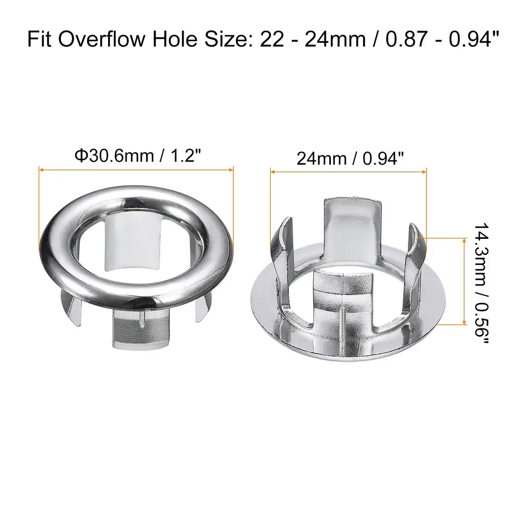 Description:Made of ABS plastic material that is sturdy and durable, has good wear and corrosion resistance. With an electroplate finish that ensures surface gloss and brightness, can be used for a long time without fading.The sink trim overflow covers look stylish and modern, can decorate the overflow hole but not clog it, and makes your sink look cleaner and tidy. Not easily fall off after installation and won't scratch the surface of the sink.Installation is quick and easy, before installing, measure the hole size, then simply push and snap into desired position. The installation can be finished in a few minutes, no tools are required.The sink overflow rings are widely used in most types of wash basins, suitable for bathtubs, homes, gardens, kitchens, bathrooms, shopping malls, hotels, factories, etc.Specification:Material: ABSFit Overflow Hole Size: 22 - 24mm/0.87 - 0.94inchHole Dia.: 24mm/0.94inchTotal Size: 30.6 x 14.3mm/1.2 x 0.56inch(D*H)Package Content:2pcs x Sink Trim Overflow Cover
