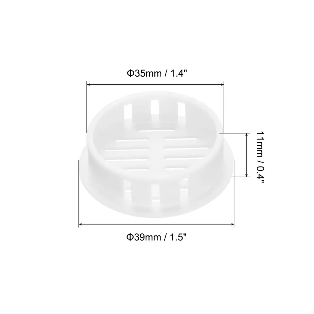 Description:Material: This air vent is made of ABS plastic, durable, impact-resistant, scratch-resistant, moisture-resistant, corrosion-resistant, nontoxic and odorless, not only has oxidation resistance but also has a more beautiful installation effect. No screws included.Advanced Advantage: The ABS plastic air vent is sturdy but lightweight, has smooth edges, simpler and safer for installation.ABS plastic mesh design, the air flows easily, and the small strip exhaust port can block dust, not easy to block.Wide Application: This air vent is used in offices, meeting rooms, auditoriums, music halls, bedrooms, kitchens, bathrooms, storage rooms and anywhere else air needs to move.How to Install: It is recommended to wear gloves during installation when installing push the cover into the mounting hole, it will snap firmly and not easily loosen.Note: Before purchasing these round vent covers, carefully measure the diameter of the mounting hole. If the mounting hole is too large or too small, the installation of these round soffit vents will fail.Specification:Item Weight: 80g/2.82 OzPackage Dimensions:Outside Diameter: 35mm / 1.4in;Bottom Diameter: 39mm / 1.5in; Mounting Height: 11mm / 0.4in; Color: WhiteMaterial: ABS PlasticPackage Content: 30Pcs of Round Soffit Vents