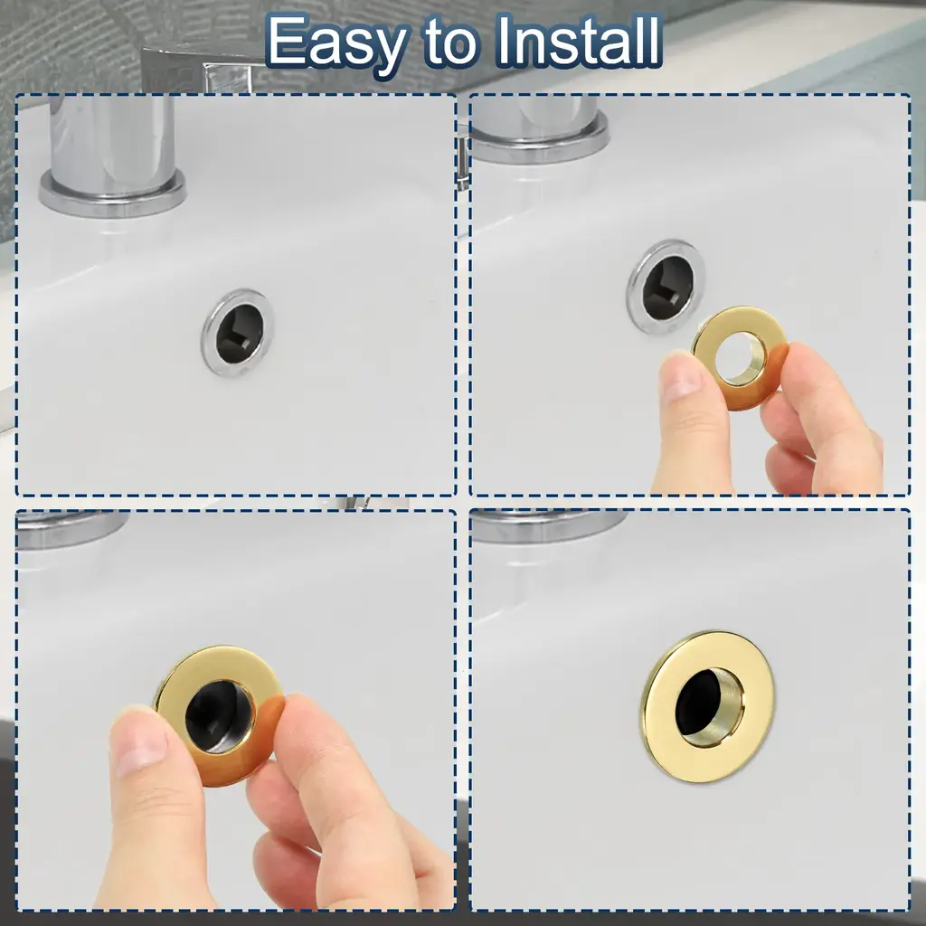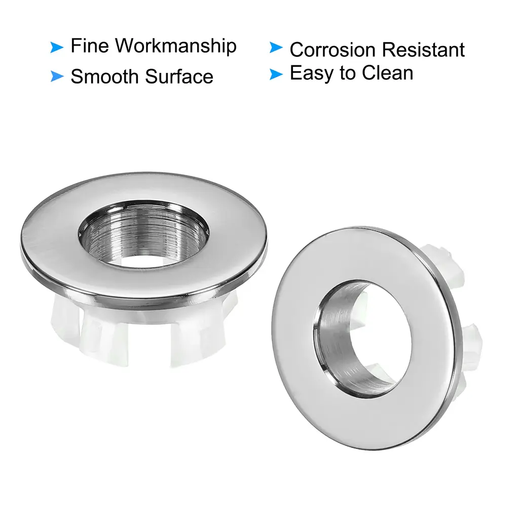 Overflow Ring is widely used for sink, bathtub, bidet, and basin. Suitable for home, office, kitchen, bathroom, dormitory, hotel, shopping mall, factory, and various places.Specification Color: SilverMaterial: Copper; PlasticOuter Diameter: 30 mm/ 1.2 inchInner Diameter: 13 mm/ 0.5 inchApplicable Aperture Size: 22 mm - 24 mm/0.86 inch to 0.94 inchPackage List: 3 x Sink Round RingAdvantageThe overflow cover is constructed from copper material, is fine workmanship, smooth surface, is corrosion resistant, easy to clean, and durable in use for a long time. Comes with a fashionable and bright appearance, equipped with decorative overflow holes that prevent clogging. The coating adheres well, resulting in a delicate and uniform color.InstructionEasy to Install, just push it into place, no tools are required. Please don't worry about pushing it in, it won't scratch your pot.NOTE:The sink overflow cover fits 22 mm/0.86 inch hole to 24 mm/0.94 inch hole, please make sure it matches your sink before purchasing.Put a little soap on it and it will slide in easily without breaking the lid's feet.