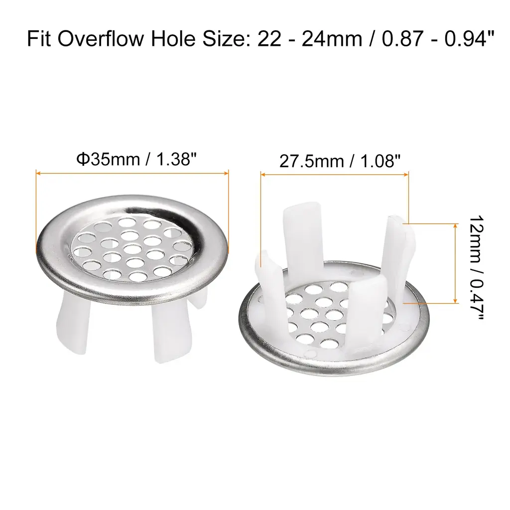 Description:Made of good hardness stainless steel material that has great wear and corrosion resistance, not eay to rust and durable to use. With an electroplate finish that ensures surface gloss and brightness, can be used for a long time without fading.The sink trim overflow covers look stylish and modern, can decorate the overflow hole but not clog it, and makes your sink looks cleaner and tidy. Not easily fall off after installation and won't scratch the surface of the sink.Installation is quick and easy, before installing, measure the hole size, then simply push and snap into desired position. The installation can be finished in a few minutes, no tools are required.The sink overflow rings are widely used in most types of wash basins, suitable for bathtubs, homes, gardens, kitchens, bathrooms, shopping malls, hotels, factories, etc.Specification:Material: Stainless SteelHole Dia.: 27.5mm/1.08inchTotal Size: 35 x 12mm/1.38 x 0.47inch(D*H)Fit Overflow Hole Size: 22 - 24mm/0.87 - 0.94inchPackage Content:3pcs x Sink Trim Overflow Cover