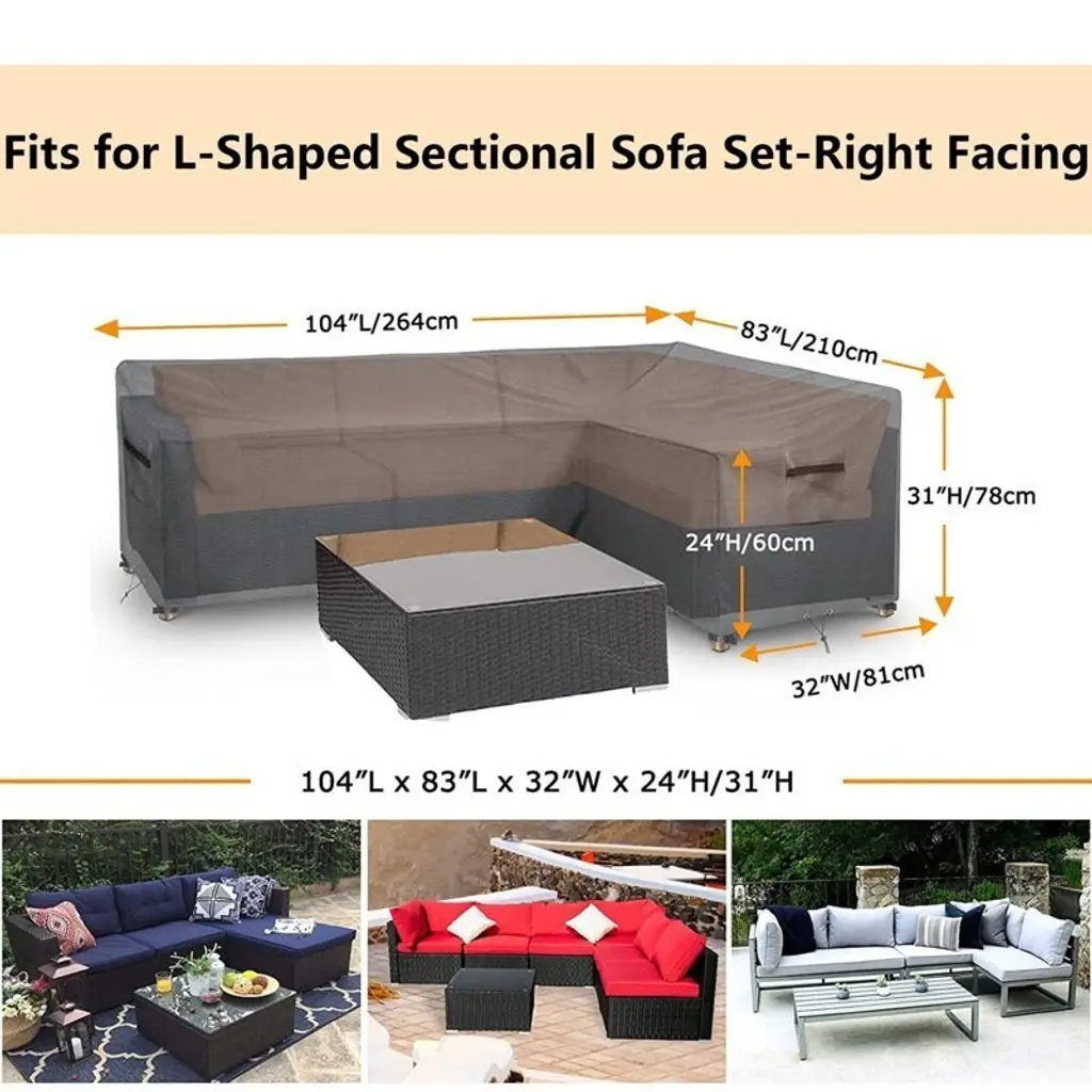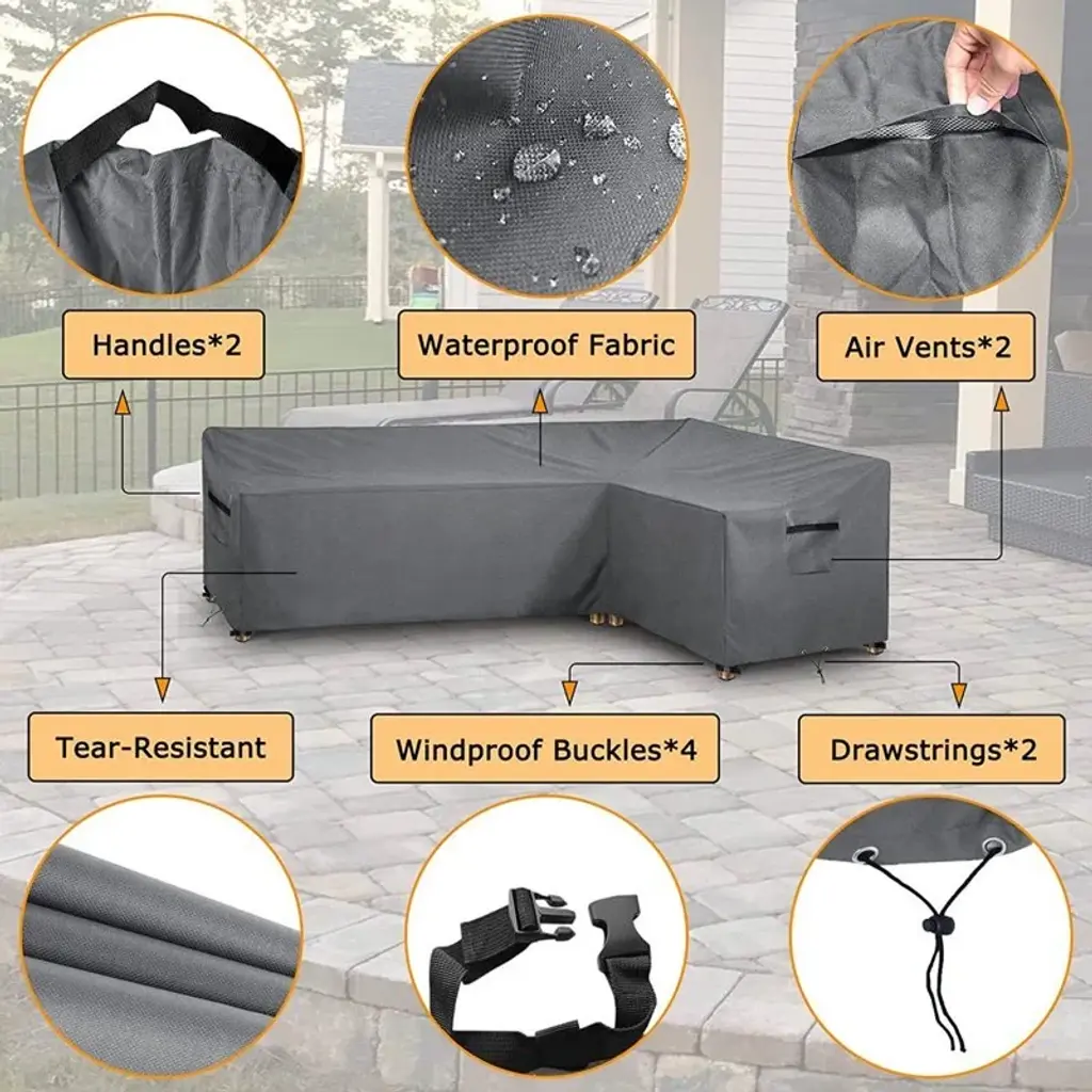 L SHAPED PATIO FURNITURE COVER - Left Facing patio furniture covers is big enough to cover your 5-7 piece furniture set.The patio furniture covers are made of high density 600DD waterproof durable oxford fabric, which is more waterproof, durable and tear-resistant than 420D fabric. Don't worry about your furniture will be effected by outside elements such as sun, rain, snow, dust, leaves, etc. NOTE:The size of your outside furniture is less than 1-2 inch than the cover size, it is most suitable. Please check your size for a proper fitFeatures: