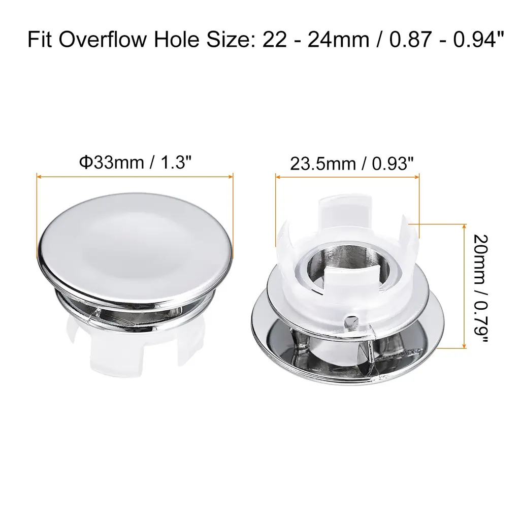 Description:Made of ABS plastic material that is sturdy and durable, has good wear and corrosion resistance. With an electroplate finish that ensures surface gloss and brightness, can be used for a long time without fading.The sink trim overflow covers look stylish and modern, can decorate the overflow hole but not clog it, and makes your sink look cleaner and tidy. Not easily fall off after installation and won't scratch the surface of the sink.Installation is quick and easy, before installing, measure the hole size, then simply push and snap into desired position. The installation can be finished in a few minutes, no tools are required.The sink overflow rings are widely used in most types of wash basins, suitable for bathtubs, homes, gardens, kitchens, bathrooms, shopping malls, hotels, factories, etc.Specification:Material: ABSFit Overflow Hole Size: 22 - 24mm/0.87 - 0.94inchHole Dia.: 23.5mm/0.93inchTotal Size: 33 x 20mm/1.3 x 0.79inch(D*H)Package Content:4pcs x Sink Trim Overflow Cover