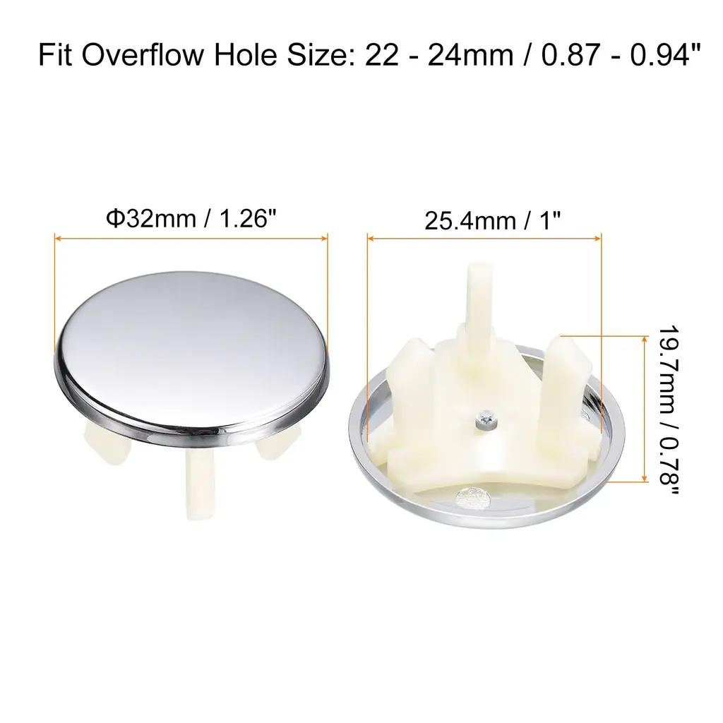 Description:Made of ABS plastic material that is sturdy and durable, has good wear and corrosion resistance. With an electroplate finish that ensures surface gloss and brightness, can be used for a long time without fading.The sink trim overflow covers look stylish and modern, can decorate the overflow hole but not clog it, and makes your sink look cleaner and tidy. Not easily fall off after installation and won't scratch the surface of the sink.Installation is quick and easy, before installing, measure the hole size, then simply push and snap into desired position. The installation can be finished in a few minutes, no tools are required.The sink overflow rings are widely used in most types of wash basins, suitable for bathtubs, homes, gardens, kitchens, bathrooms, shopping malls, hotels, factories, etc.Specification:Material: ABSFit Overflow Hole Size: 22 - 24mm/0.87 - 0.94inchHole Dia.: 25.4mm/1inchTotal Size: 32 x 19.7mm/1.26 x 0.78inch(D*H)Package Content:4pcs x Sink Trim Overflow Cover