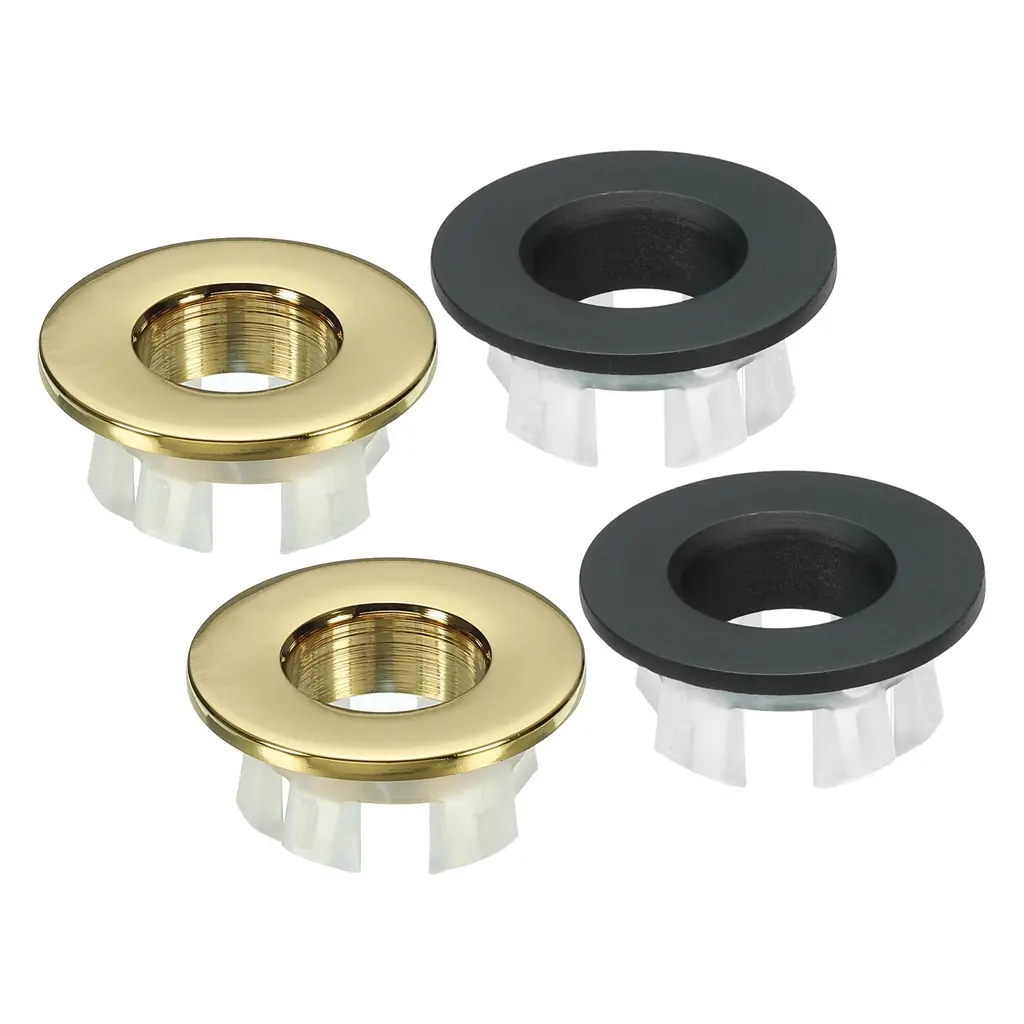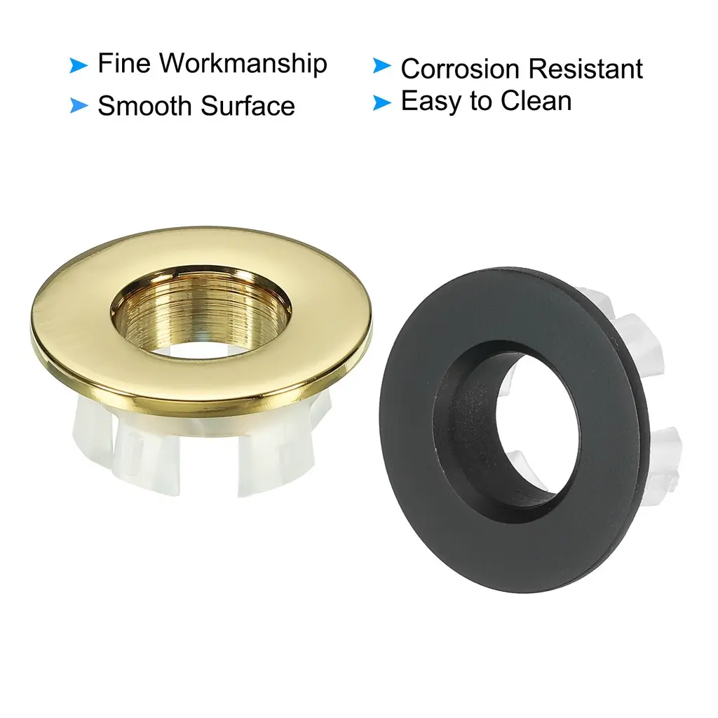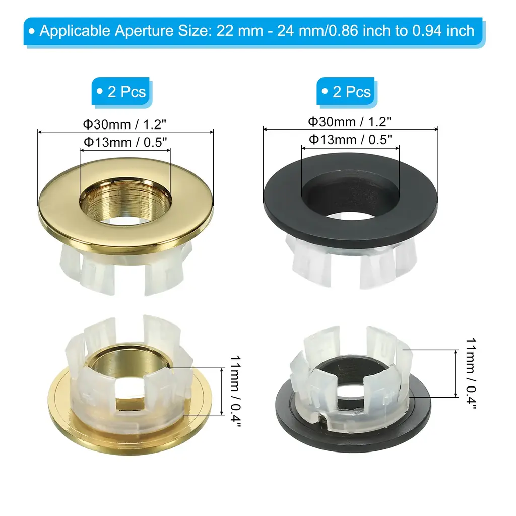 Overflow Ring is widely used for sink, bathtub, bidet, and basin. Suitable for home, office, kitchen, bathroom, dormitory, hotel, shopping mall, factory, and various places.Specification Color: Black, SilverMaterial: Copper; PlasticOuter Diameter: 30 mm/ 1.2 inchInner Diameter: 13 mm/ 0.5 inchApplicable Aperture Size: 22 mm - 24 mm/0.86 inch to 0.94 inchPackage List: 4 x Sink Round Ring (2Pcs of each color)AdvantageThe overflow cover is constructed from copper material, is fine workmanship, smooth surface, is corrosion resistant, easy to clean, and durable in use for a long time. Comes with a fashionable and bright appearance, equipped with decorative overflow holes that prevent clogging. The coating adheres well, resulting in a delicate and uniform color.InstructionEasy to Install, just push it into place, no tools are required. Please don't worry about pushing it in, it won't scratch your pot.NOTE:The sink overflow cover fits 22 mm/0.86 inch hole to 24 mm/0.94 inch hole, please make sure it matches your sink before purchasing.Put a little soap on it and it will slide in easily without breaking the lid's feet.