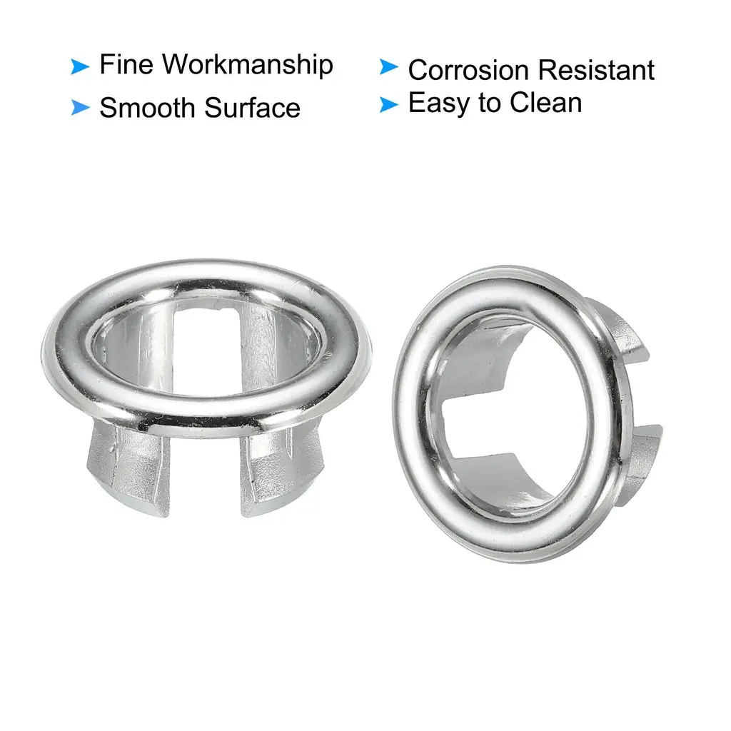 Overflow Ring is widely used for sink, bathtub, bidet, and basin. Suitable for home, office, kitchen, bathroom, dormitory, hotel, shopping mall, factory, and various places.Specification Color: SilverMaterial: ABSApplicable Aperture Size: 22 mm - 24 mm/0.86 inch to 0.94 inchPackage List: 4 x Sink Round RingAdvantageThe overflow cover is constructed from ABS material, is fine workmanship, smooth surface, is corrosion resistant, easy to clean, and durable in use for a long time. Comes with a fashionable and bright appearance, equipped with decorative overflow holes that prevent clogging. The coating adheres well, resulting in a delicate and uniform color.InstructionEasy to Install, just push it into place, no tools are required. Please don't worry about pushing it in, it won't scratch your pot.NOTE:The sink overflow cover fits 22 mm/0.86 inch hole to 24 mm/0.94 inch hole, please make sure it matches your sink before purchasing.Put a little soap on it and it will slide in easily without breaking the lid's feet.