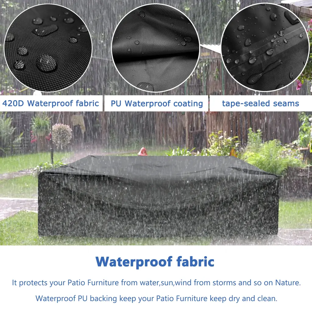 Safeguard your outdoor sectional sofa and patio furniture set against the harshest elements with our Heavy Duty Patio Furniture Covers. Meticulously crafted from resilient 500D Oxford fabric, these covers offer unparalleled weatherproof, waterproof, and tear-resistant protection, ensuring your furniture's longevity. Key Features:Choose the best fit for your furniture set and keep it clean, dry, and well-preserved with our Heavy Duty Patio Furniture Covers. Order now for year-round protection.