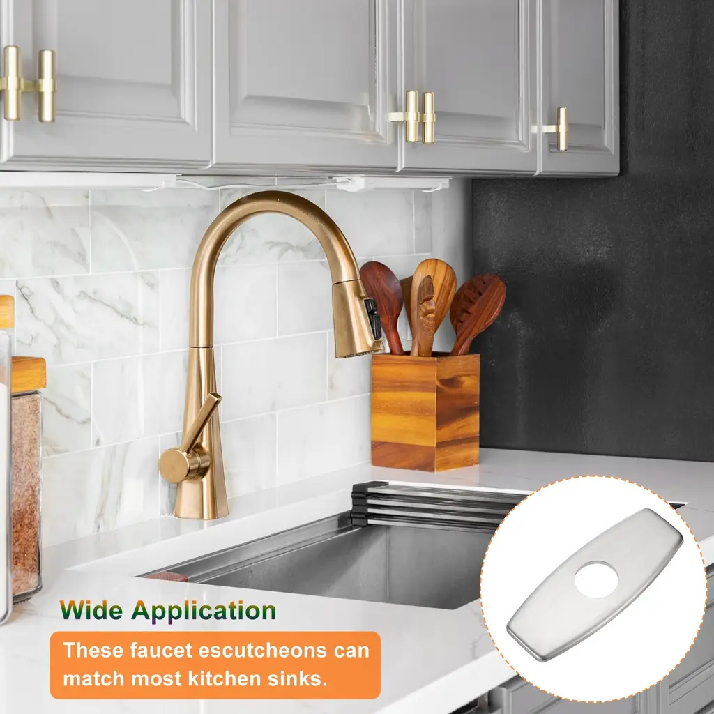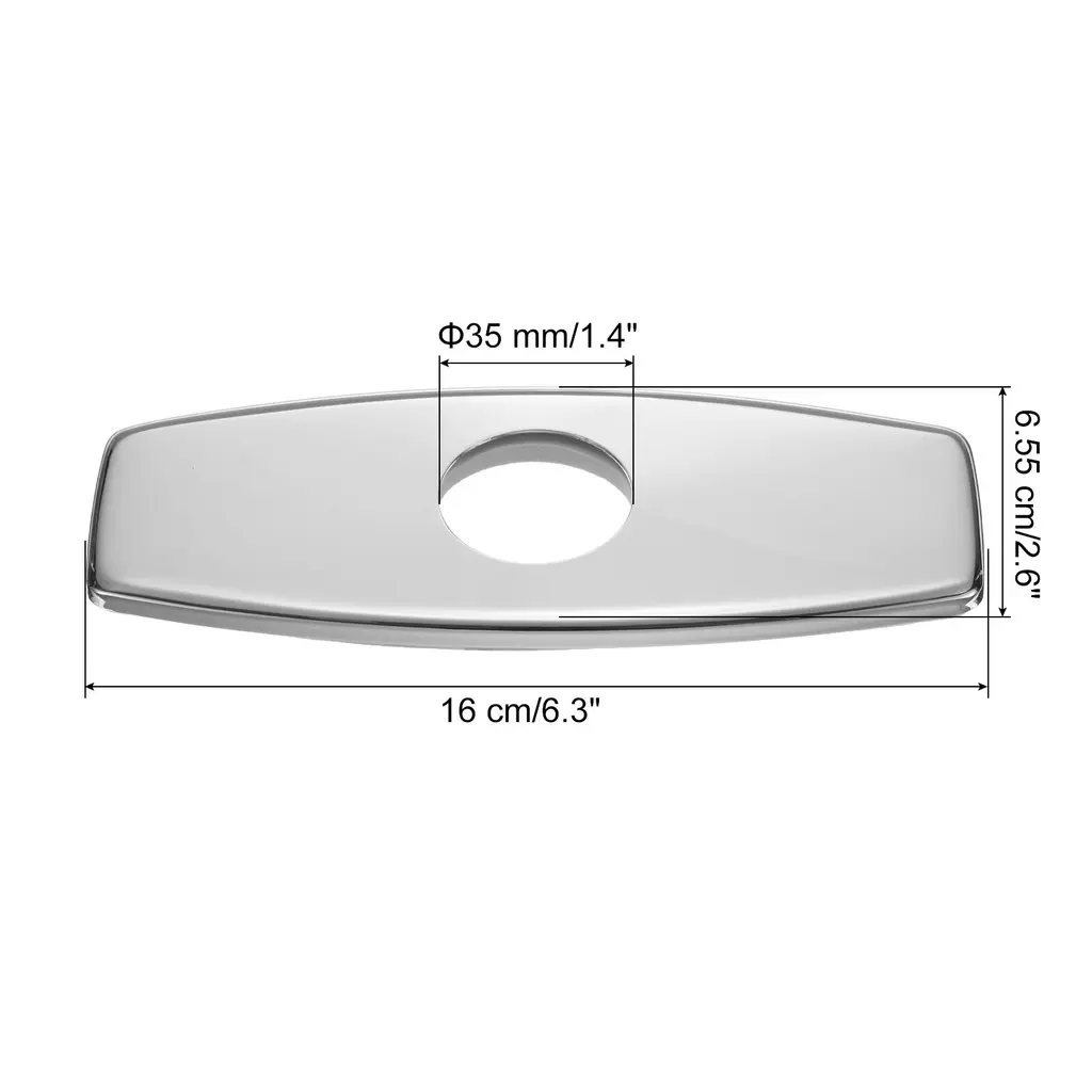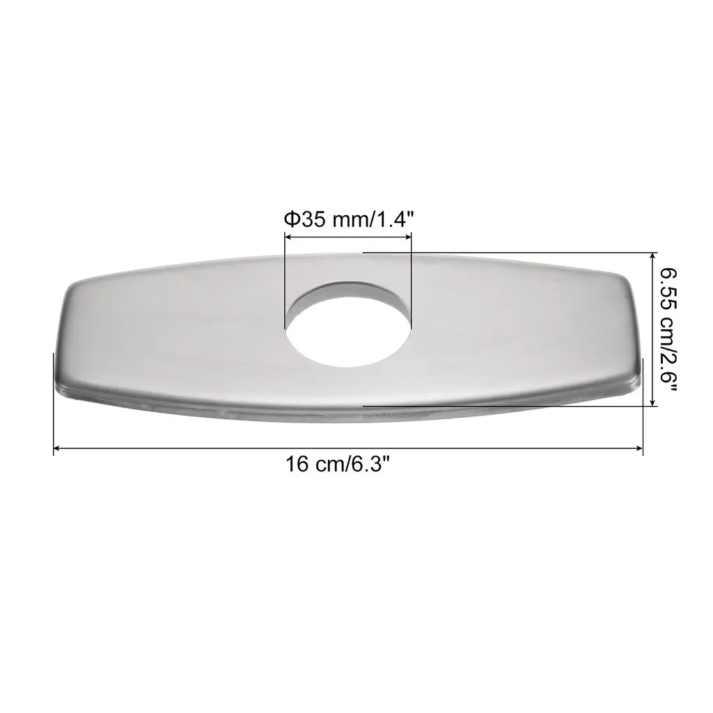Advantage:The hole cover plate is made of stainless steel, with surface treatment, resistant to scratches, corrosion, and tarnishing.Designed with a thick white foam pad under the case can effectively prevent water from leaking through the sink hole.The hole cover allows a single-hole faucet to be installed on 3 3-hole sinks and covers the unused outer holes of the bathroom sink.Just put the cover plate under the faucet, then tighten the faucet, It can be cleaned only with a soft cloth, saving you time.Keep your kitchen faucet clean and tidy, sink hole cover can match most sinks, such as stainless steel/ceramic kitchen sink, and bathroom sink.Specification:Material: Stainless steelColor: Brushed SilverSize: 16 cm x 6.6 cm/6.3 inch x 2.6 inch (L*W)Thickness: 6 mm/0.26 inchHole Diameter: 35 mm/1.4 inchPackage Included: 1pcs x faucet cover plate
