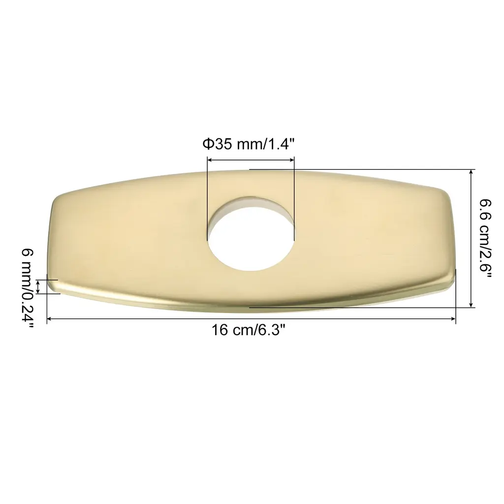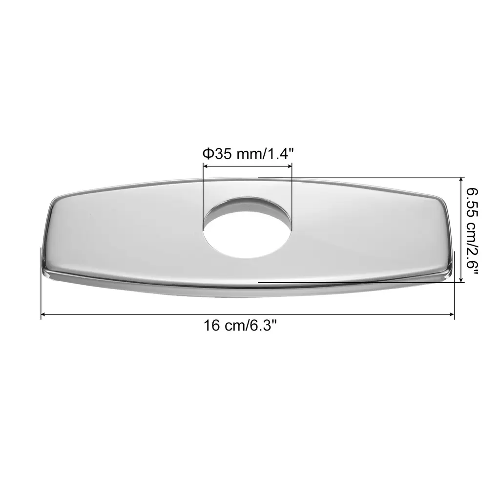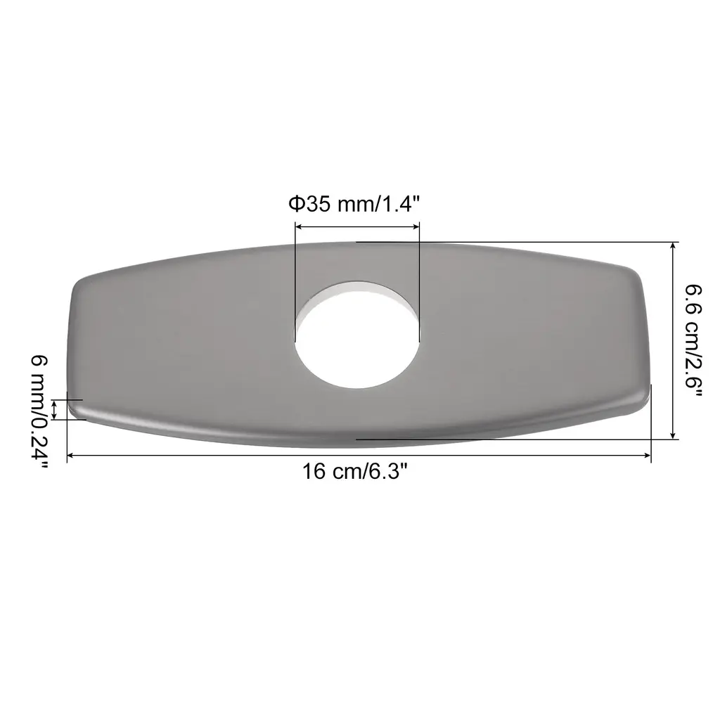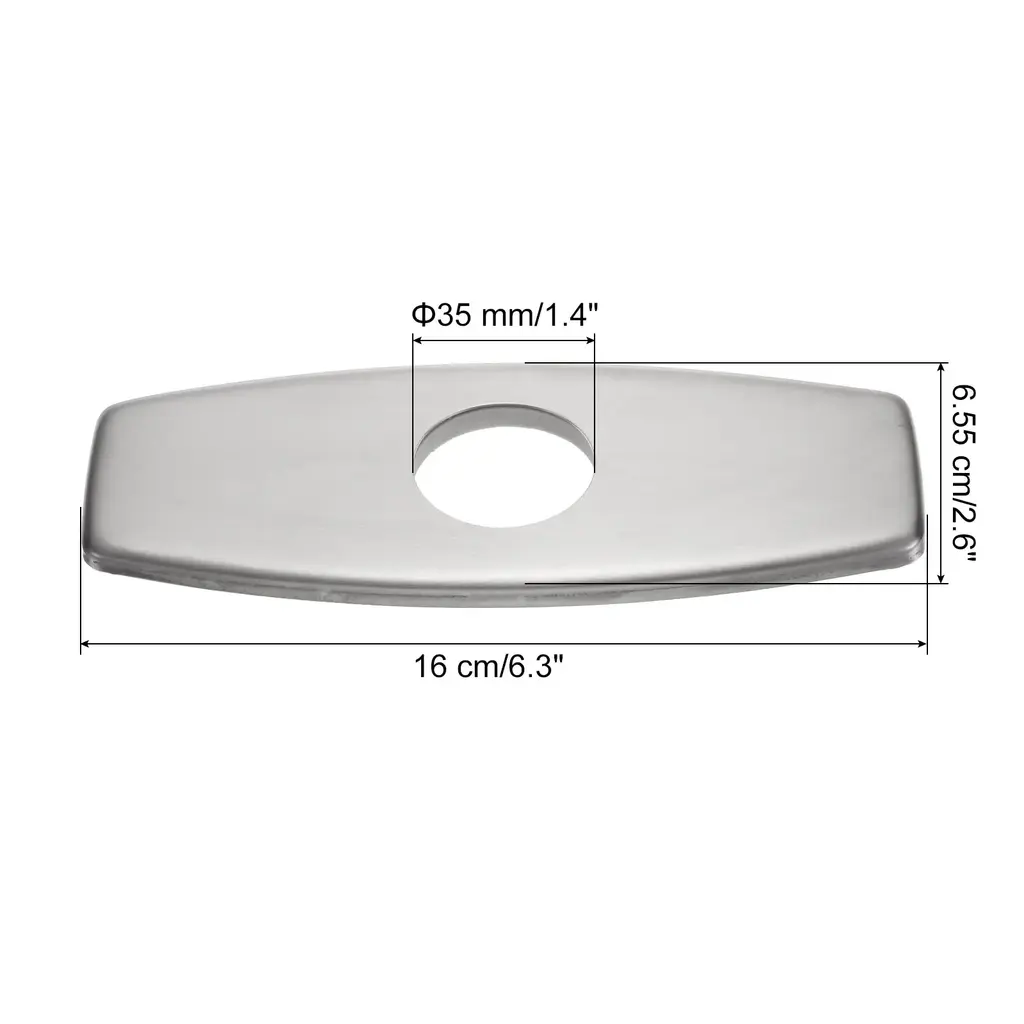 Advantage:The hole cover plate is made of stainless steel, with surface treatment, resistant to scratches, corrosion, and tarnishing.Designed with a thick white foam pad under the case can effectively prevent water from leaking through the sink hole.The hole cover allows a single-hole faucet to be installed on 3 3-hole sinks and covers the unused outer holes of the bathroom sink.Just put the cover plate under the faucet, then tighten the faucet, It can be cleaned only with a soft cloth, saving you time.Keep your kitchen faucet clean and tidy, sink hole cover can match most sinks, such as stainless steel/ceramic kitchen sink, and bathroom sink.Specification:Material: Stainless steelColor: Brushed SilverSize: 16 cm x 6.6 cm/6.3 inch x 2.6 inch (L*W)Thickness: 6 mm/0.26 inchHole Diameter: 35 mm/1.4 inchPackage Included: 1pcs x faucet cover plate