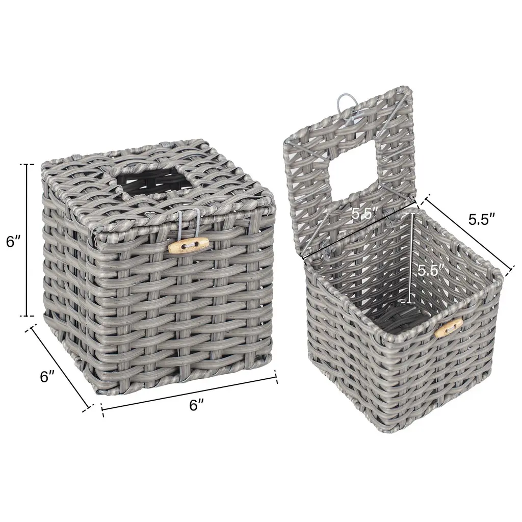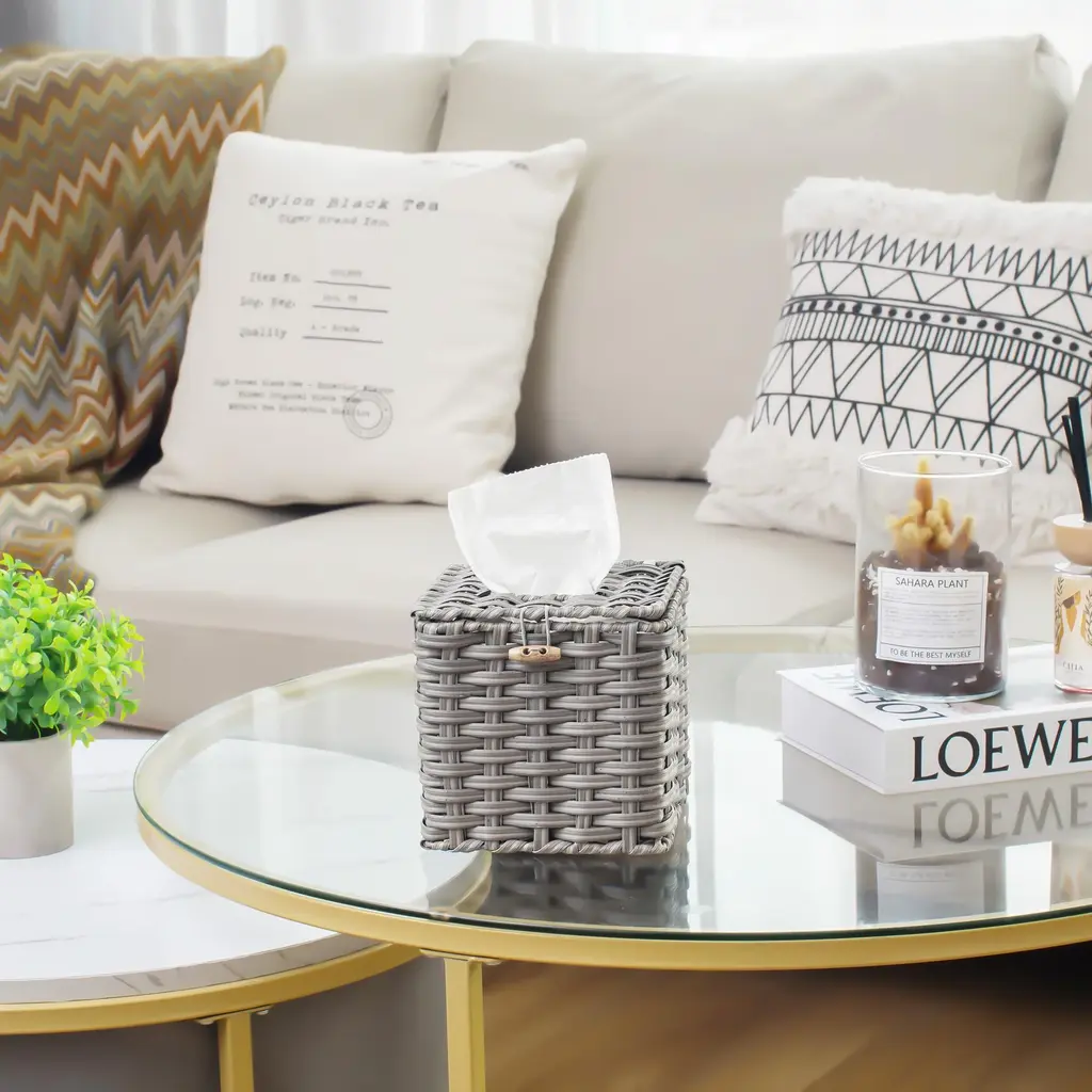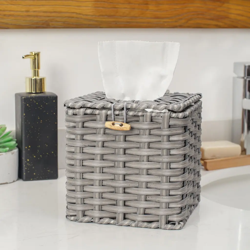 Tired of mismatched tissue boxes disturbing your decor? This synthetic rattan tissue box cover is a great choice for those who want to add a touch of natural style to their home decor. Blending functionality with a stylish design, the bathroom tissue holder is easy to refill and prevents wastage thanks to the toggle button and lid. The bathroom storage basket is durably constructed and easy to clean and can be used in any room. Available in three color choices, this rattan tissue box cover holds most of the standard cube-sized tissue boxes.We Want to Hear From You!Shopping should be happy and satisfying! We want everything to be perfect for you. Should you have any problems with our products or tracking the order, please feel free to contact us through messages or email at cs@wellzone.life We have customer services stand by 24/7.