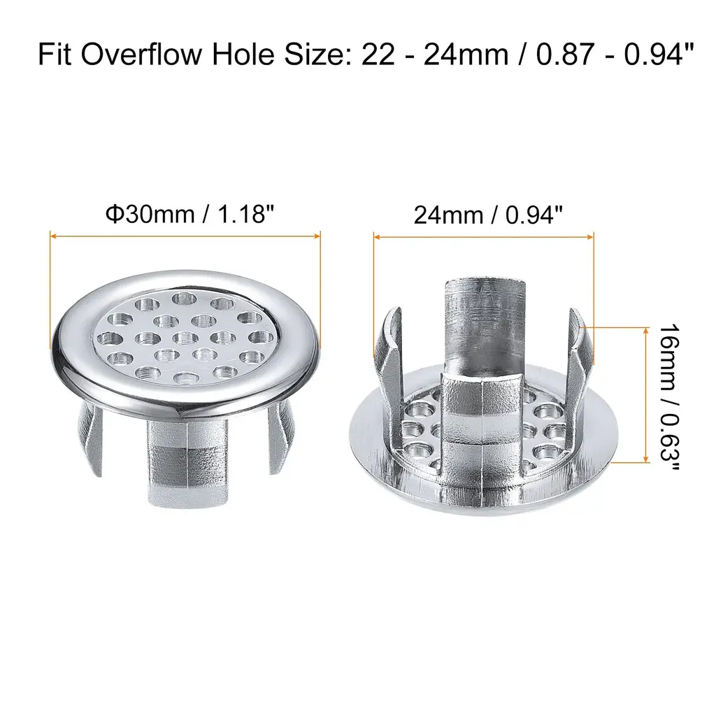 Description:Made of ABS plastic material that is sturdy and durable, has good wear and corrosion resistance. With an electroplate finish that ensures surface gloss and brightness, can be used for a long time without fading.The sink trim overflow covers look stylish and modern, can decorate the overflow hole but not clog it, and makes your sink look cleaner and tidy. Not easily fall off after installation and won't scratch the surface of the sink.Installation is quick and easy, before installing, measure the hole size, then simply push and snap into desired position. The installation can be finished in a few minutes, no tools are required.The sink overflow rings are widely used in most types of wash basins, suitable for bathtubs, homes, gardens, kitchens, bathrooms, shopping malls, hotels, factories, etc.Specification:Material: ABSFit Overflow Hole Size: 22 - 24mm/0.87 - 0.94inchHole Dia.: 24mm/0.94inchTotal Size: 30 x 16mm/1.18 x 0.63inch(D*H)Package Content:6pcs x Sink Trim Overflow Cover