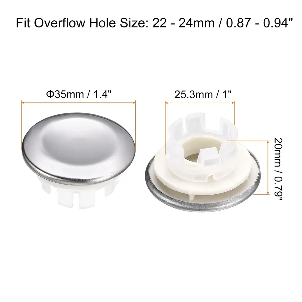 Description:Made of good hardness stainless steel material that has great wear and corrosion resistance, not eay to rust and durable to use. With an electroplate finish that ensures surface gloss and brightness, can be used for a long time without fading.The sink trim overflow covers look stylish and modern, can decorate the overflow hole but not clog it, and makes your sink looks cleaner and tidy. Not easily fall off after installation and won't scratch the surface of the sink.Installation is quick and easy, before installing, measure the hole size, then simply push and snap into desired position. The installation can be finished in a few minutes, no tools are required.The sink overflow rings are widely used in most types of wash basins, suitable for bathtubs, homes, gardens, kitchens, bathrooms, shopping malls, hotels, factories, etc.Specification:Material: Stainless SteelHole Dia.: 25.3mm/1inchTotal Size: 35 x 20mm/1.4 x 0.79inch(D*H)Fit Overflow Hole Size: 22 - 24mm/0.87 - 0.94inchPackage Content:6pcs x Sink Trim Overflow Cover