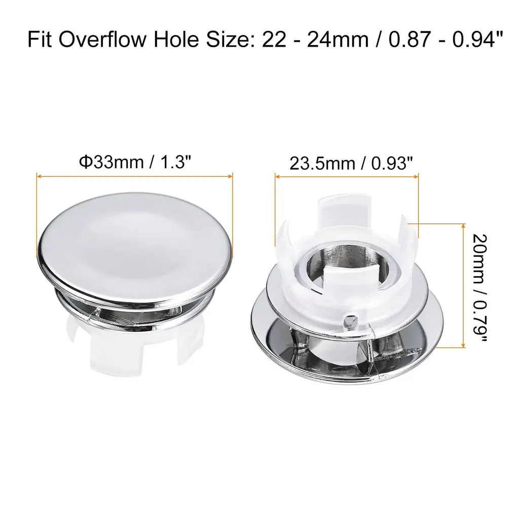 Description:Made of ABS plastic material that is sturdy and durable, has good wear and corrosion resistance. With an electroplate finish that ensures surface gloss and brightness, can be used for a long time without fading.The sink trim overflow covers look stylish and modern, can decorate the overflow hole but not clog it, and makes your sink look cleaner and tidy. Not easily fall off after installation and won't scratch the surface of the sink.Installation is quick and easy, before installing, measure the hole size, then simply push and snap into desired position. The installation can be finished in a few minutes, no tools are required.The sink overflow rings are widely used in most types of wash basins, suitable for bathtubs, homes, gardens, kitchens, bathrooms, shopping malls, hotels, factories, etc.Specification:Material: ABSFit Overflow Hole Size: 22 - 24mm/0.87 - 0.94inchHole Dia.: 23.5mm/0.93inchTotal Size: 33 x 20mm/1.3 x 0.79inch(D*H)Package Content:8pcs x Sink Trim Overflow Cover