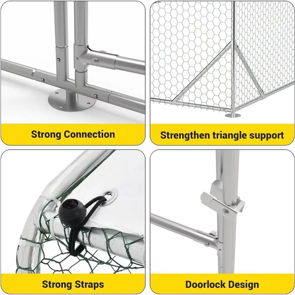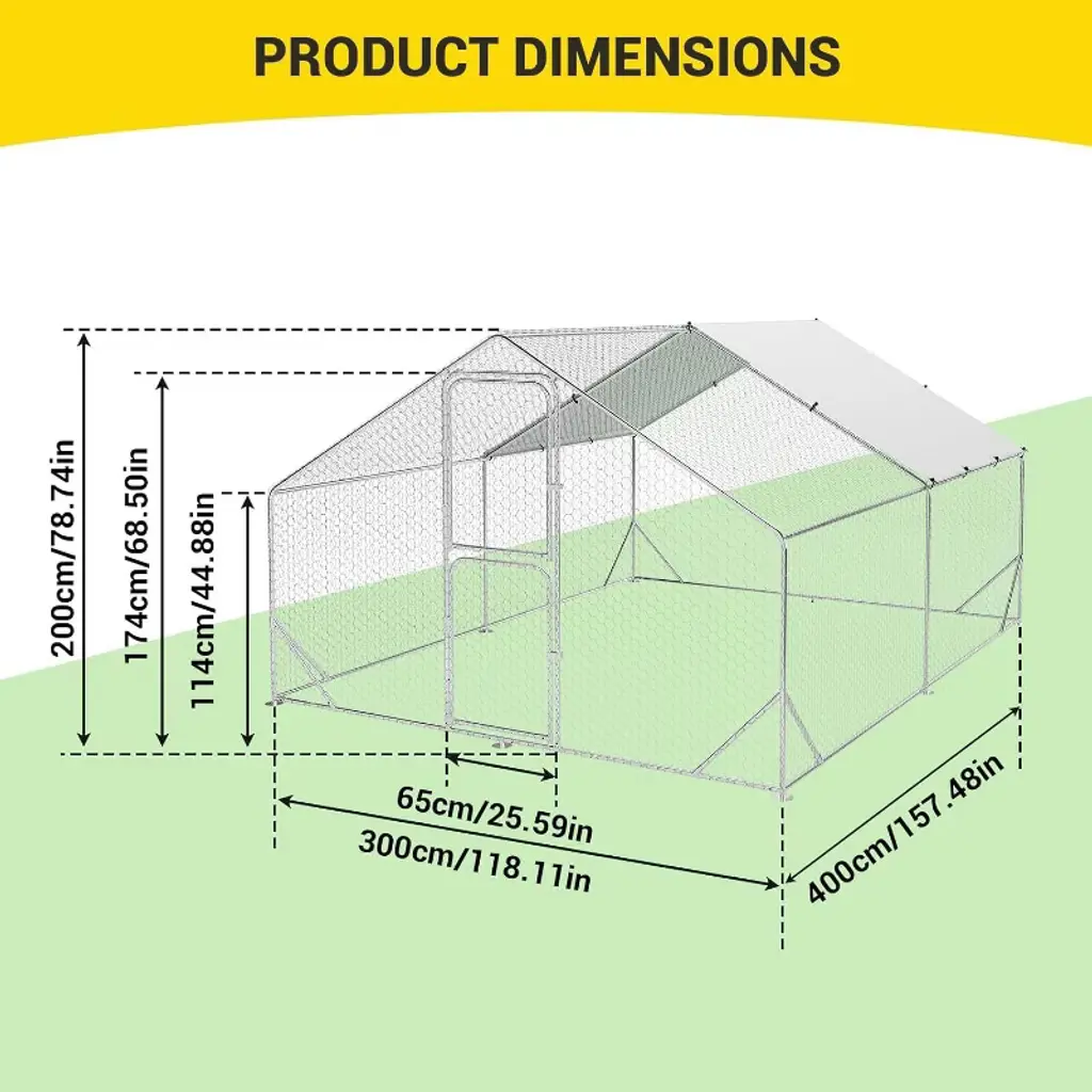 This sturdy coop provides safe outdoor living space for poultry and small animals. Thoughtful details make daily care simpler. Smart Features: ✔ Lockable access doors ✔ Removable waste trays ✔ Ventilated side panels ✔ UV-resistant coating ✔ Easy-slide roof cover Specifications: Size: 10'W x 6.5'L x 13'H Mesh Gaps: 1" hexagonal Frame: 1.2" galvanized steel Cover: 420D Oxford fabric Base Area: 66 sq ft