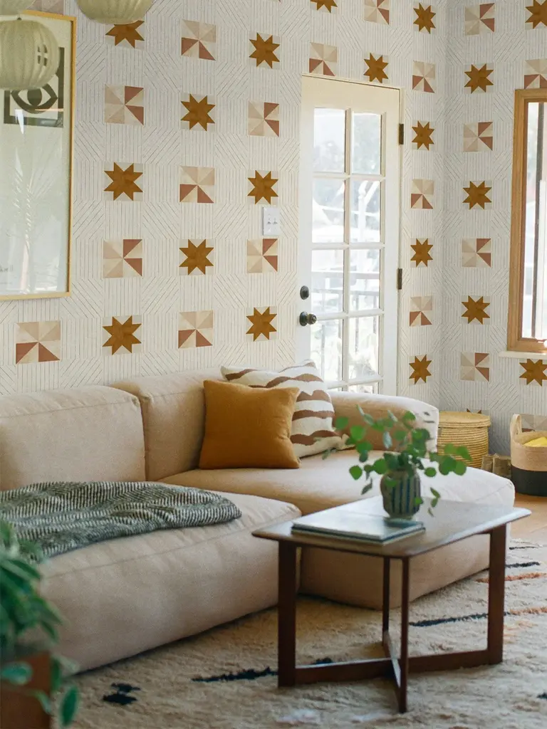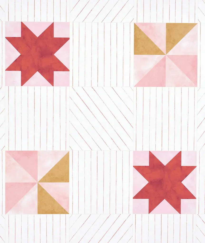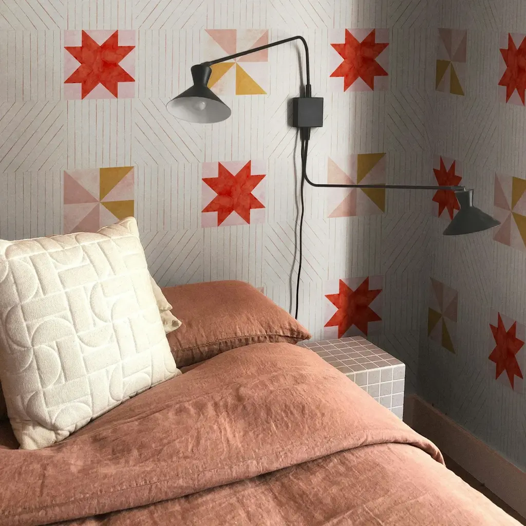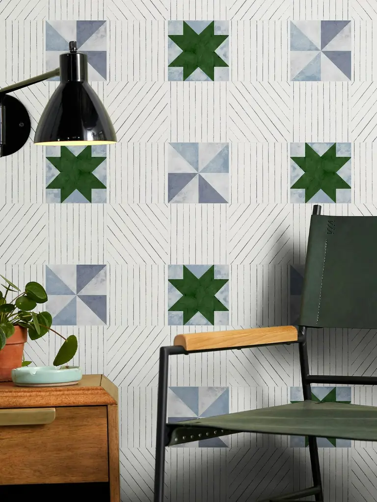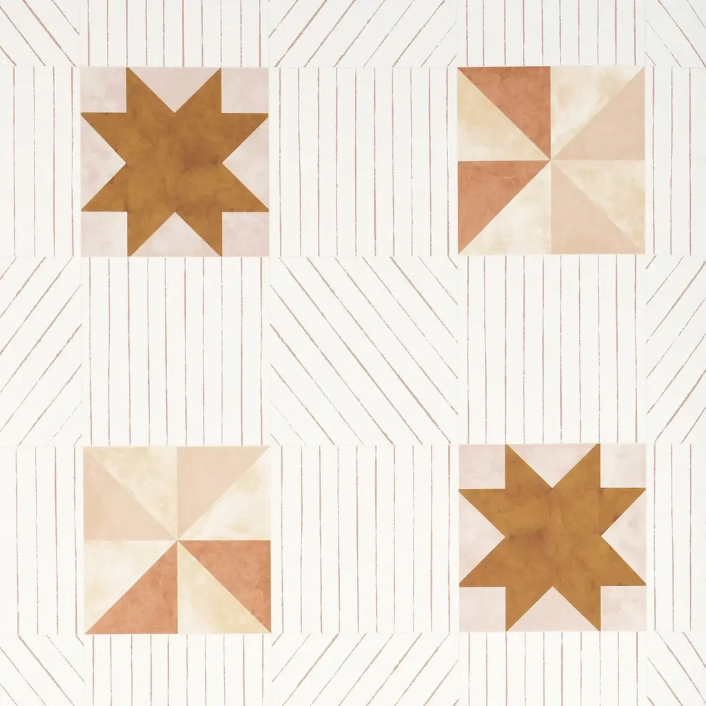 Created from original paintings, ALEXANDER is a large-scale, multi-directional, modern twist on traditional quilting crafts. Wrap your walls in simple geometries of gouache and watercolor painted motifs that have a light patina like a lovingly stitched heirloom. Backdrop wallcoverings are made from hand-crafted artwork and printed on a non-woven ground with a subtle fibrous texture. Designed in Los Angeles and expertly printed in Brooklyn. Backdrop is proudly part of the heritage design house F. Schumacher & Co.