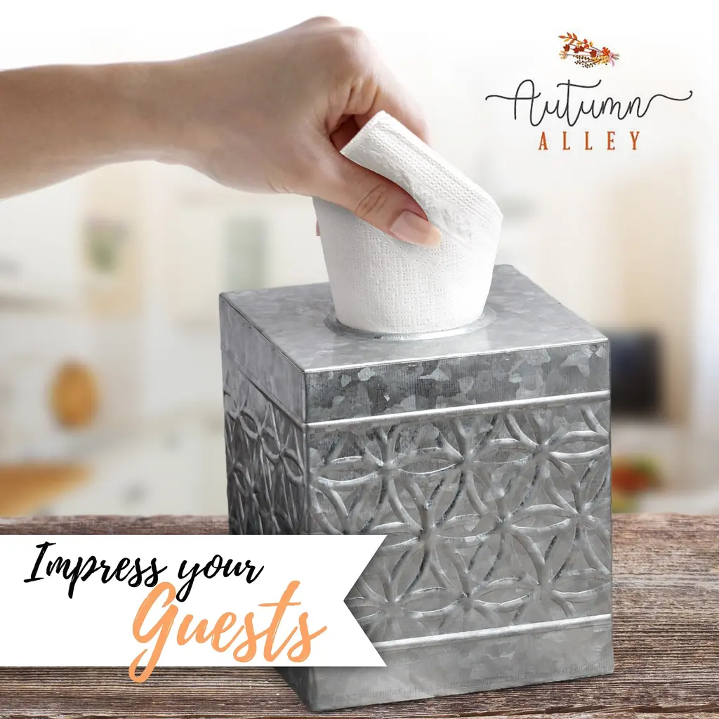 Introducing the Autumn Alley Galvanized Tissue Box Cover Square, a chic and versatile addition to your home decor. Crafted with durability in mind, this tissue box cover is constructed from high-quality galvanized metal, ensuring longevity and a touch of rustic charm. Its square design effortlessly complements various spaces, seamlessly fitting into bathrooms, bedrooms, kitchens, or any area in need of a stylish tissue holder. The embossed pattern adds an elegant texture, elevating the aesthetic appeal while disguising unsightly tissue boxes. Whether placed atop a vanity, countertop, or side table, this decorative cover serves as a functional yet eye-catching accent piece, blending seamlessly with both modern and traditional interiors. Upgrade the look of your spaces with the Autumn Alley Tissue Box Cover, offering both functionality and aesthetic appeal. Its sturdy galvanized construction ensures reliability, while the square shape and embossed pattern lend a touch of rustic elegance to any room. Perfect for bathrooms, bedrooms, or kitchens, this cover effortlessly conceals standard tissue boxes, adding a decorative element to your home. The versatile design allows for easy integration into various decor styles, making it a practical yet stylish accessory for enhancing the ambiance of your living spaces. Elevate your interior decor with this charming and durable tissue box cover, showcasing a blend of functionality and decorative finesse. Try it in matte black, copper-colored metal, glossy white, or galvanized metal!