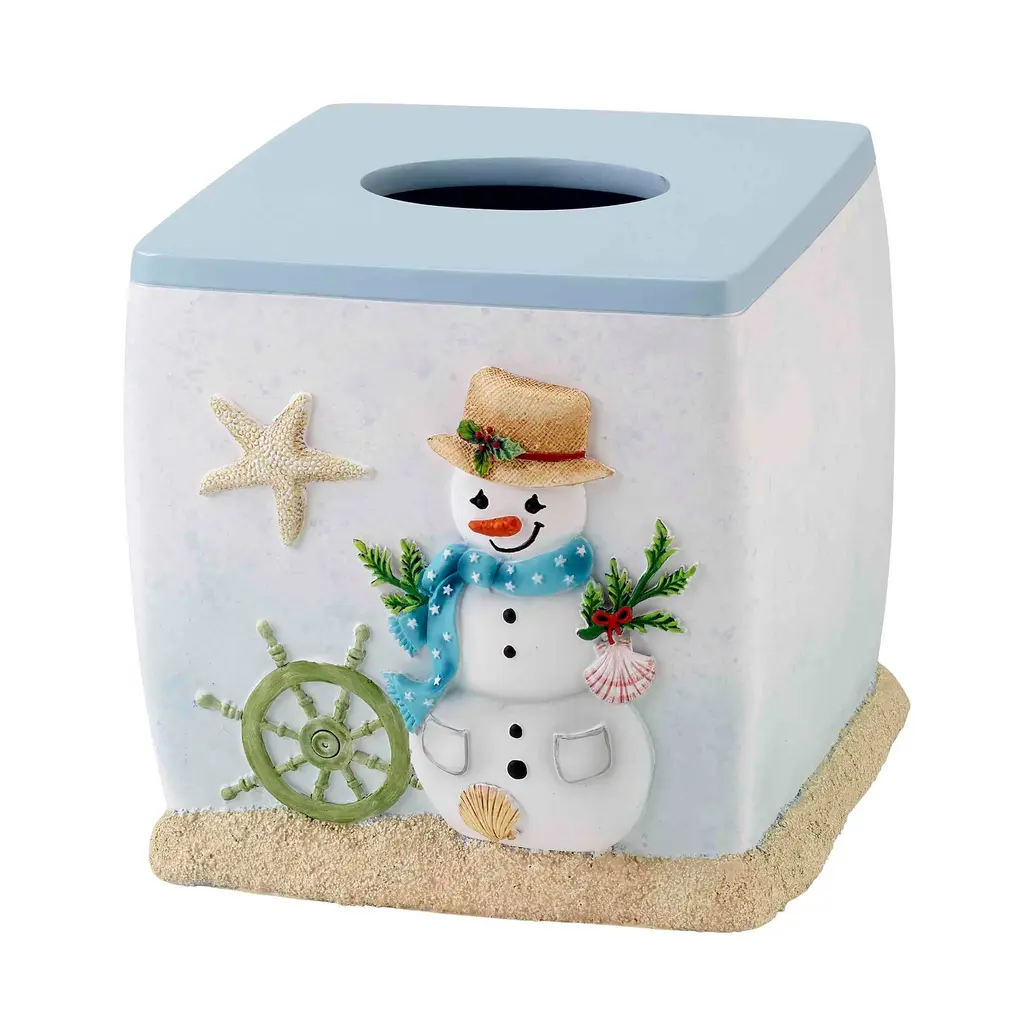 The Avanti Coastal Snowman Tissue Cover features a happy, raised snowman with a straw hat , blue polka-dotted scarf and holly with seashells, a starfish and ship's wheel. The top is ocean blue and the background is a blue and white textured ground on a sand base. Made of durable hand-painted resin.
