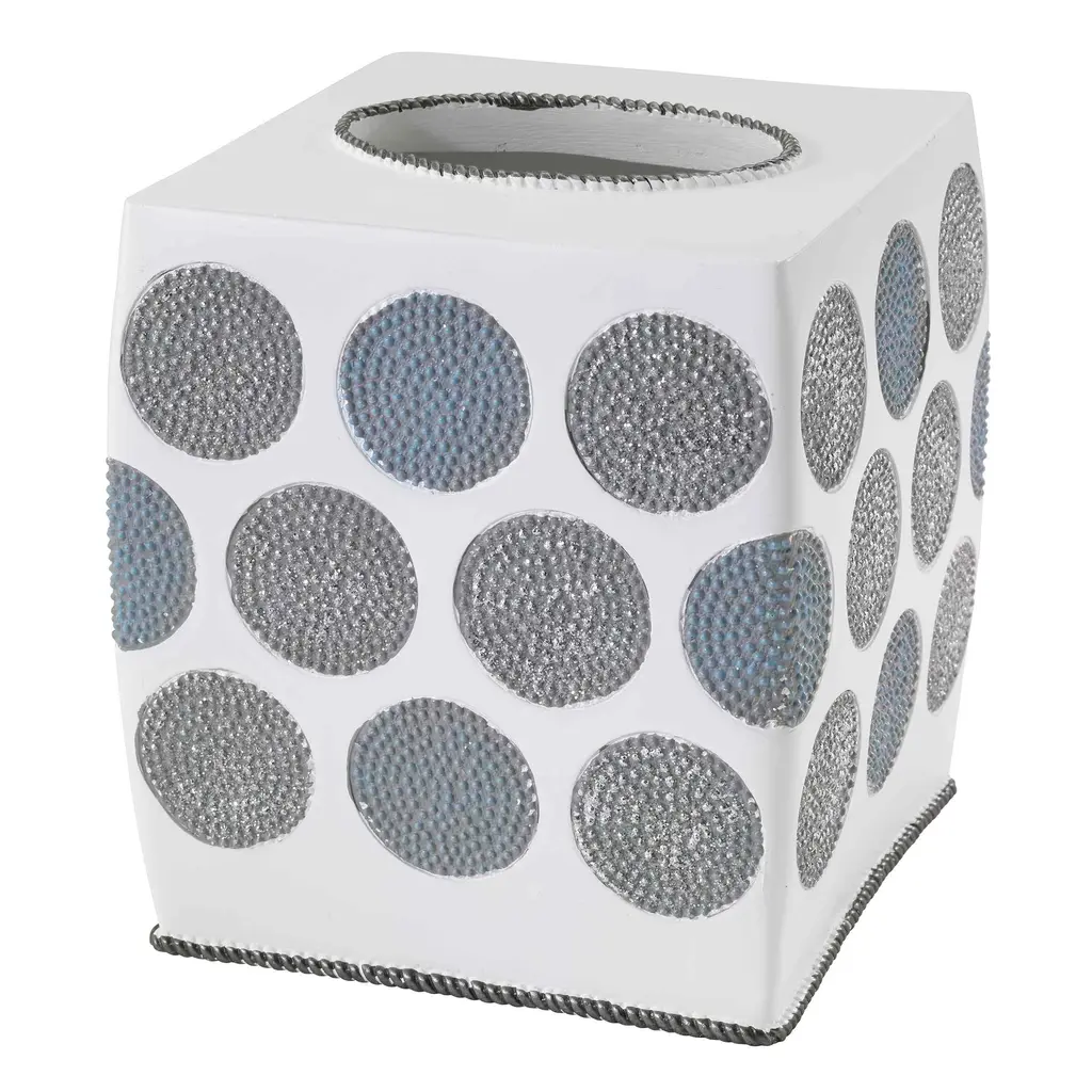 The Avanti Dotted Circles Decorative Tissue Box Cover features large slate blue and medium gray circles with metallic accents on a rounded white base. A faux metallic cord wraps the bottom. Made of durable, hand-painted resin. Coordinating shower curtain, accessories, rug and towels also available..