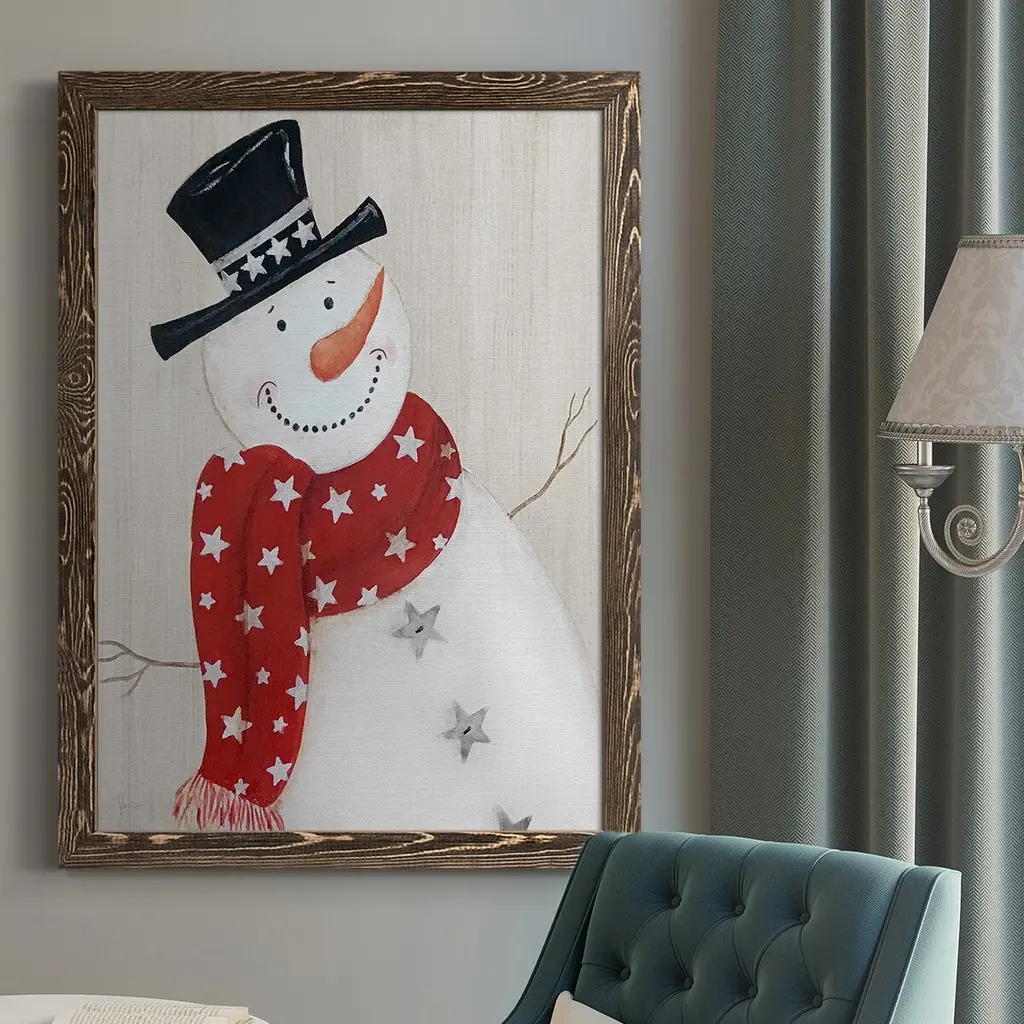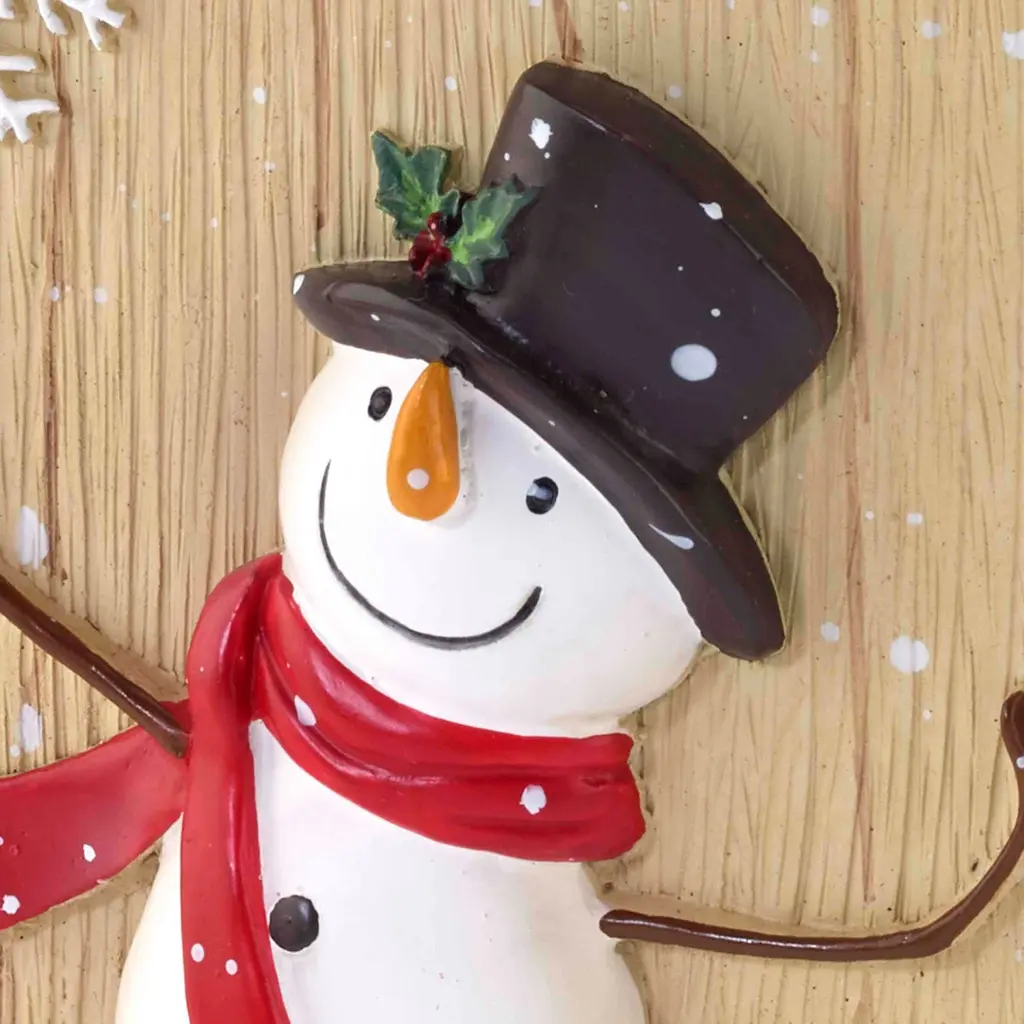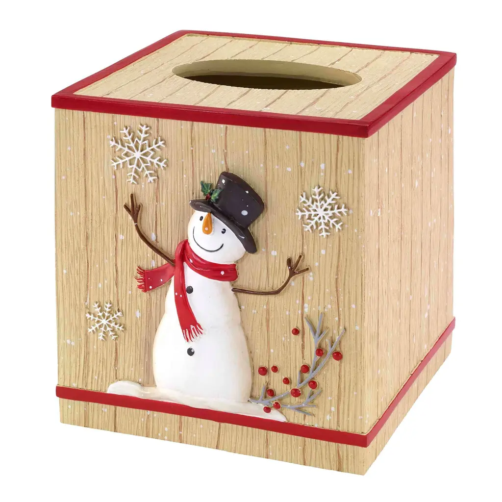 The Avanti Friends Gather Tissue Box Cover features a happy snowman with a red scarf and top hat on a beige faux wood grain. Snowflakes and white dots surround the snowman. Made of durable, hand-painted resin.