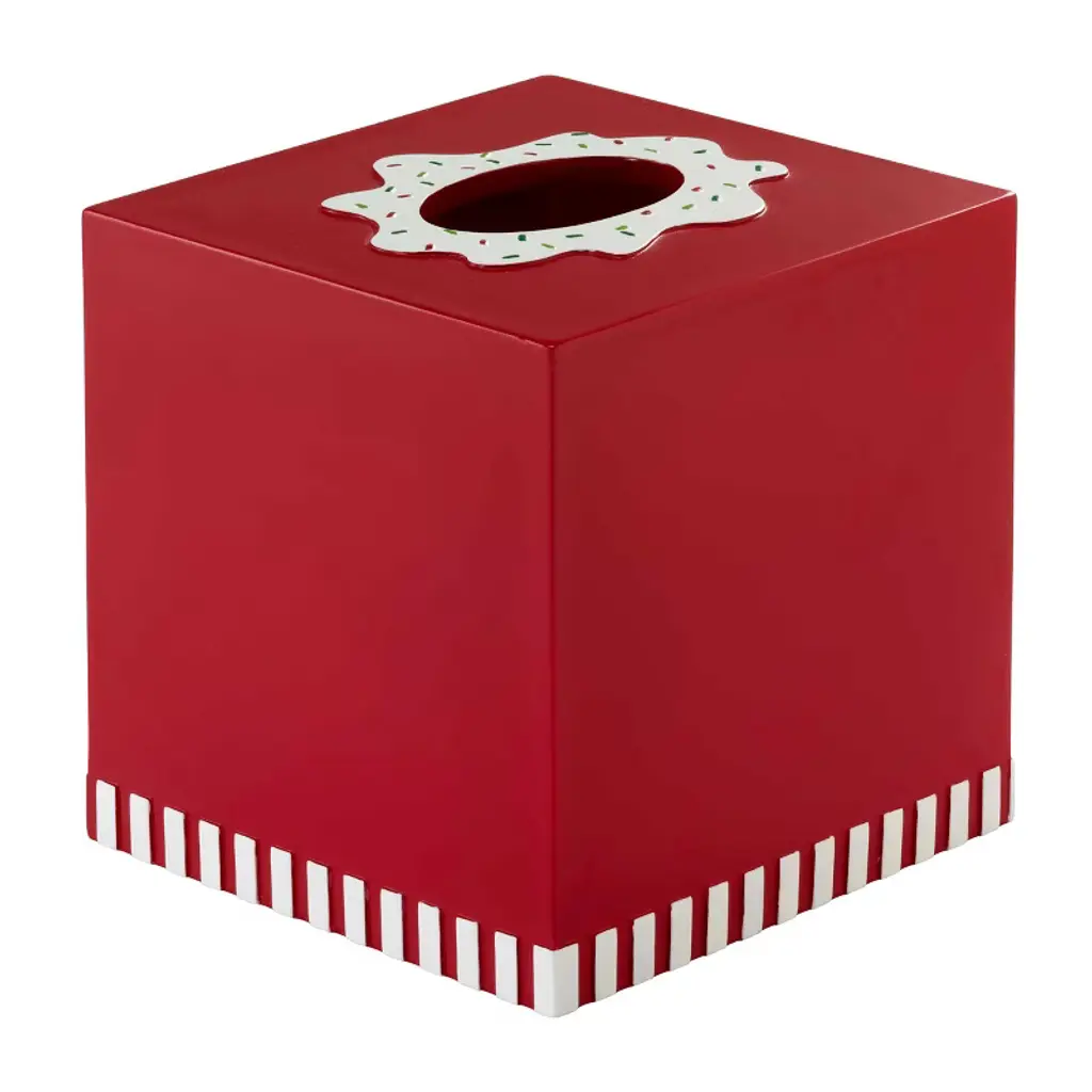 The Avanti Gingerbread Man Tissue Box Cover features a gingerbread man, house, candy and snowflakes on a Christmas red ground. A candy cane stripe wraps the bottom. Made of durable hand-painted resin. Adds the perfect holiday touch to any bathroom, bedroom, office or kitchen. Other pieces available.