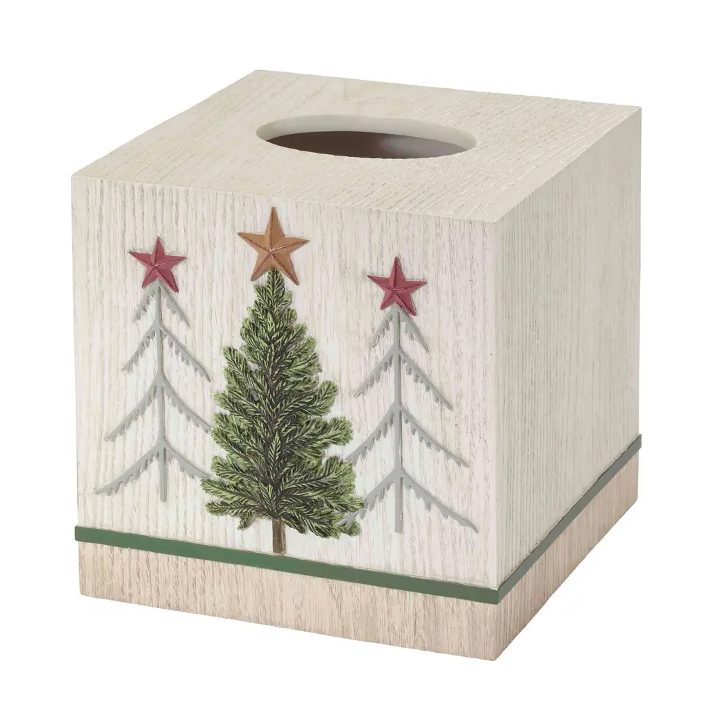The Avanti Trees Tissue Box Cover features three dimensional pine trees with stars on top, set against a green-tinged wood-look ground, with a forest green border near the bottom. Made of durable, hand-painted resin for easy care. A great holiday add for any bathroom, kitchen, bedroom or office.