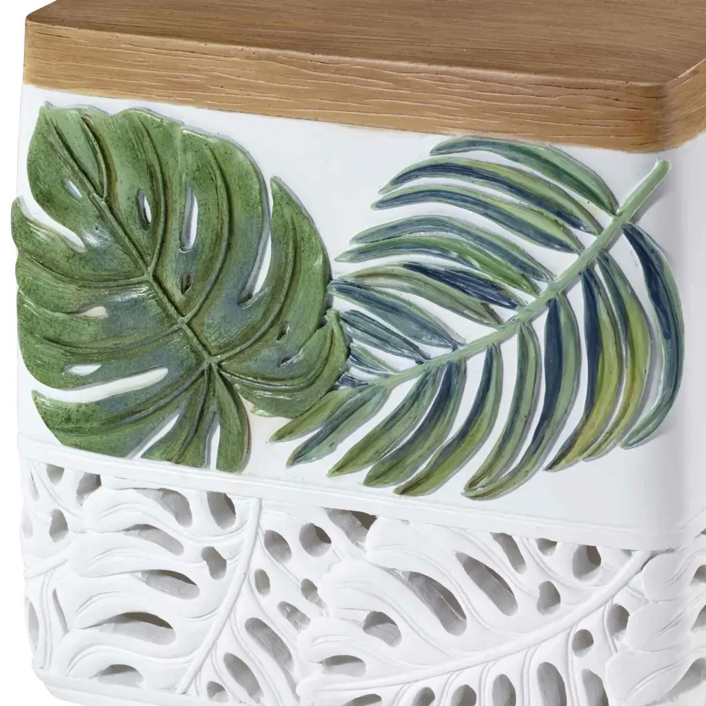 The Avanti Viva Palm Tissue Box Cover features a textural white leaf cut-out background with 2 large three-dimensional tropical leaves in multiple shades of green. The top edge is decorated with a faux-wood finish. Made of durable, hand-painted resin for long-lasting use.