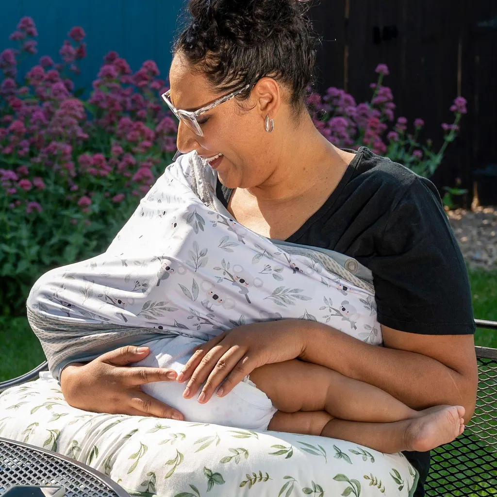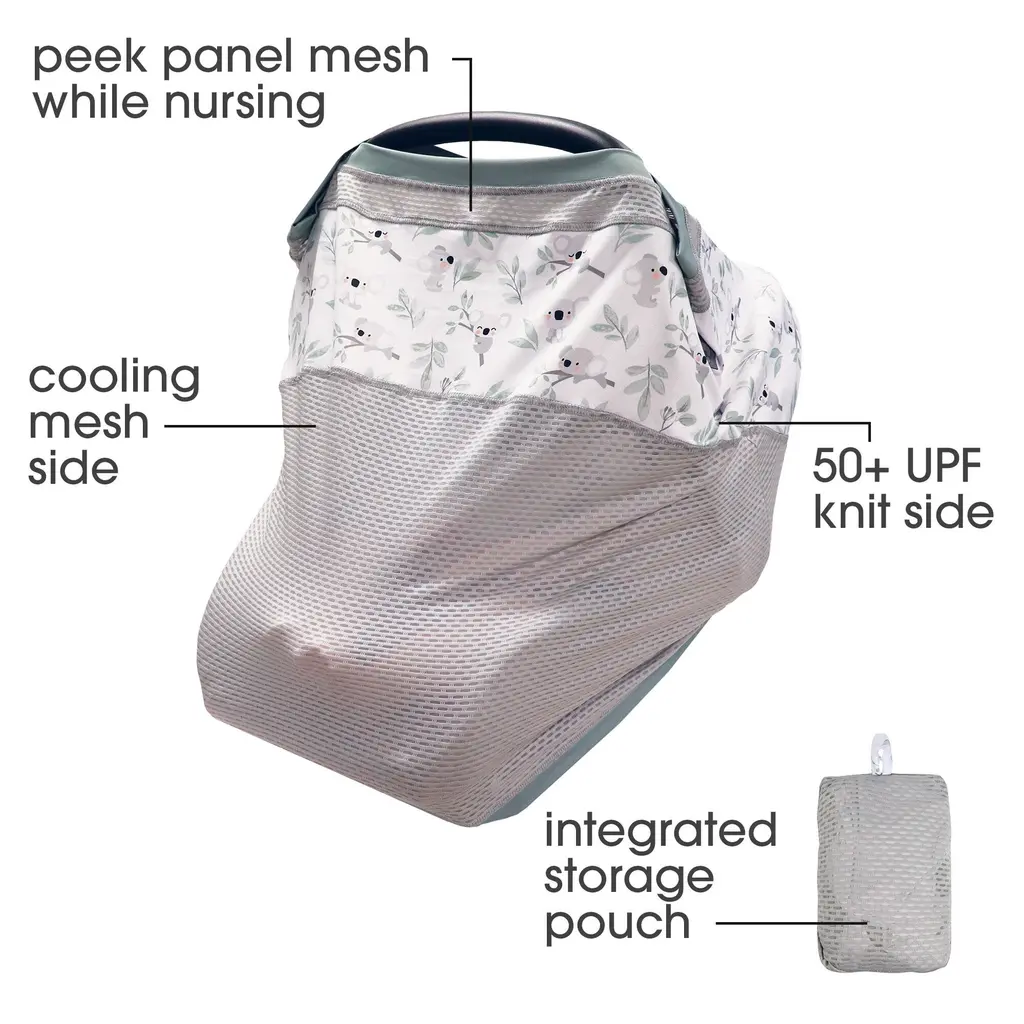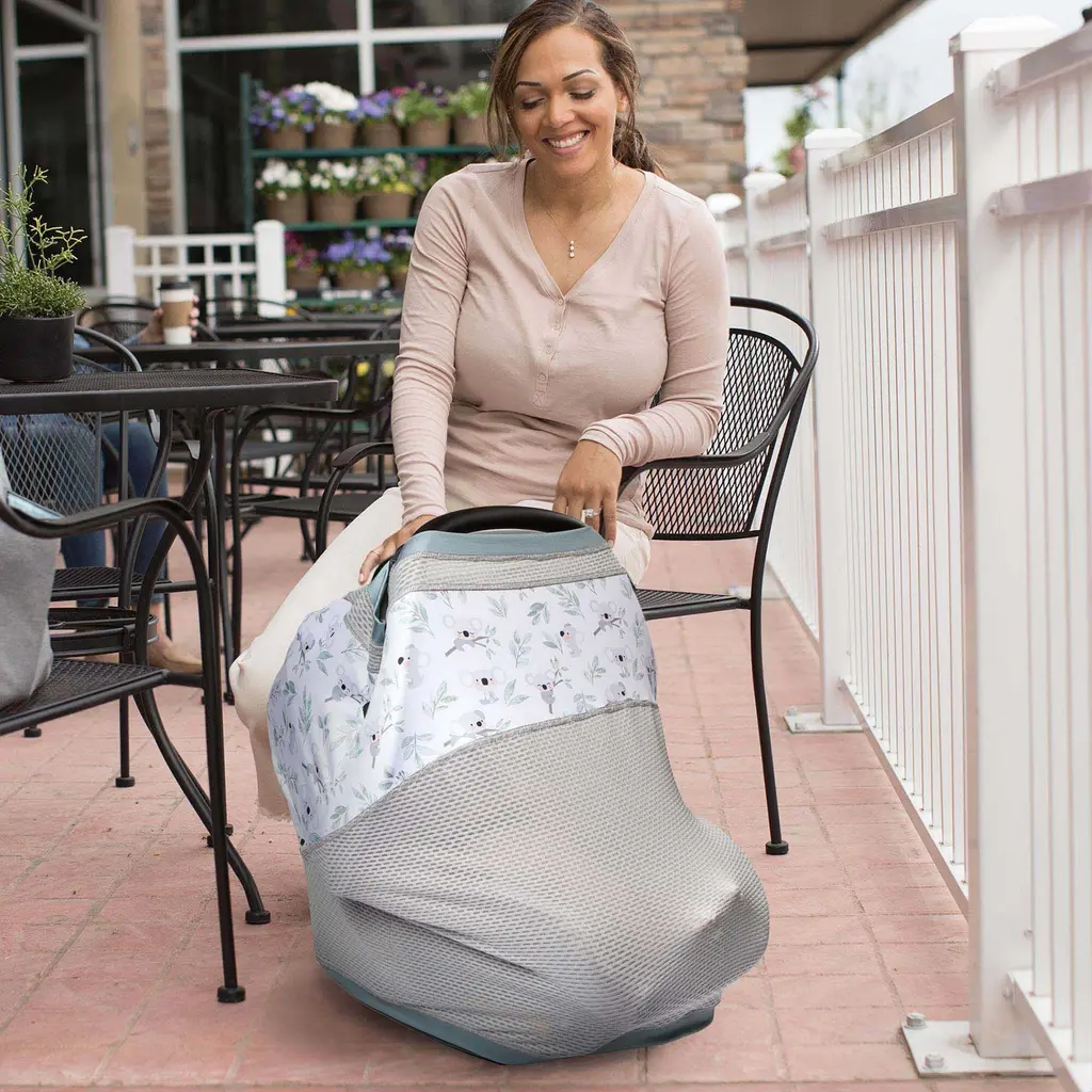 This multiuse cover is perfect for car seats, strollers, shopping carts, high chairs and more. Made with yoga-inspired, quick-dry fabric that is stretch, comfortable and durable. Use as a canopy with breathy mesh side or decrease distractions with solid knit side. Nursing scarf places breathable mesh at your back and offers UPF50+ protection to the front. Two snaps allow the cover to give a more custom fit. Offers a barrier in a restaurant high chair or shopping cart. Made with polyester and spandex material. Machine washable and tumble dry low.