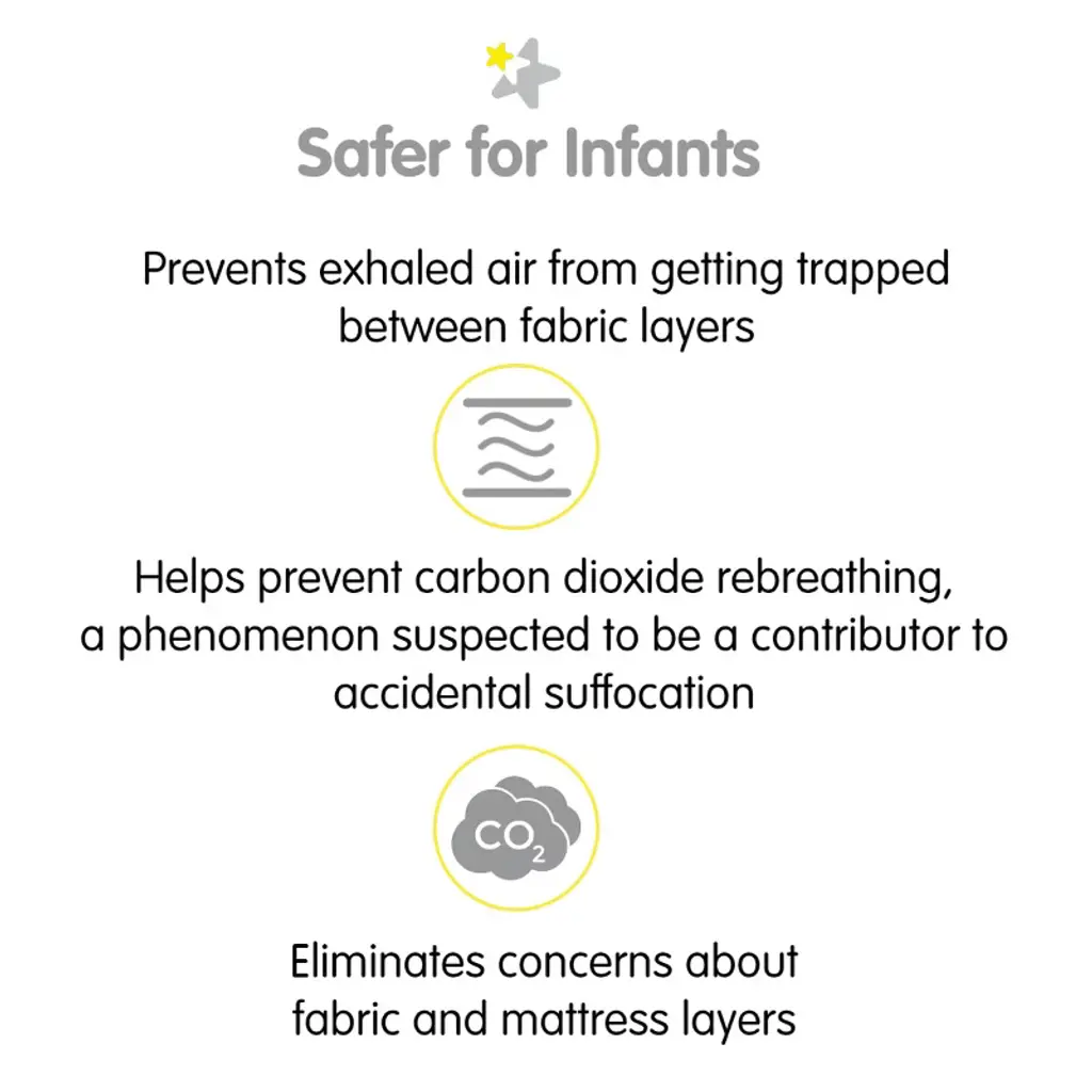 The All-in-One Fitted Sheet & Mattress Cover provides a soft fabric top surface for infants to sleep comfortably while the waterproof backing helps protect the mattress from absorbing moisture and messes. Constructed to eliminate the need for a mattress pad and maintain the safety and integrity of the mattress. Helps block exhaled air from getting trapped between fabric layers to help prevent carbon dioxide rebreathing, a phenomenon suspected to be a contributor to accidental suffocation. Acts as a solid surface to eliminate the sandwich effect found in products, like padded bumpers (banned in the US in 2022)�creating a safer sleep space from birth to 12 months.