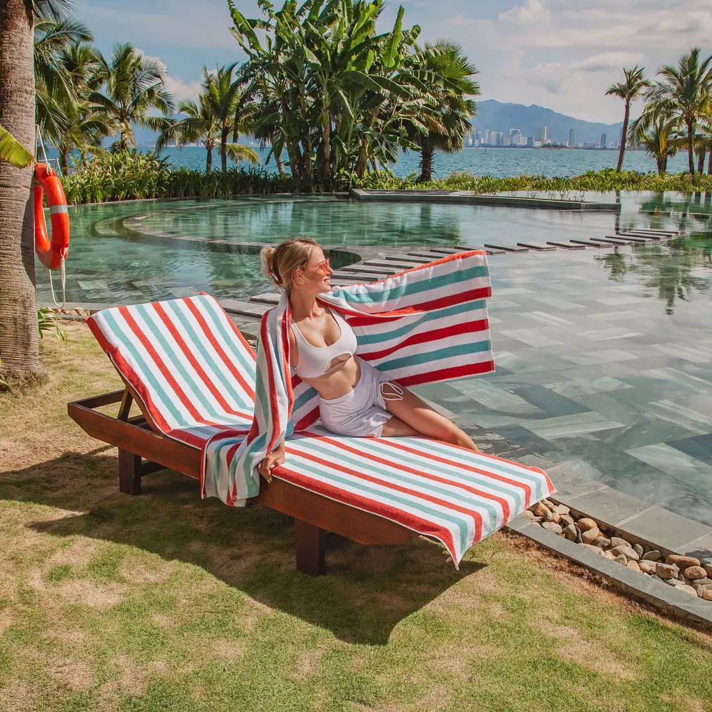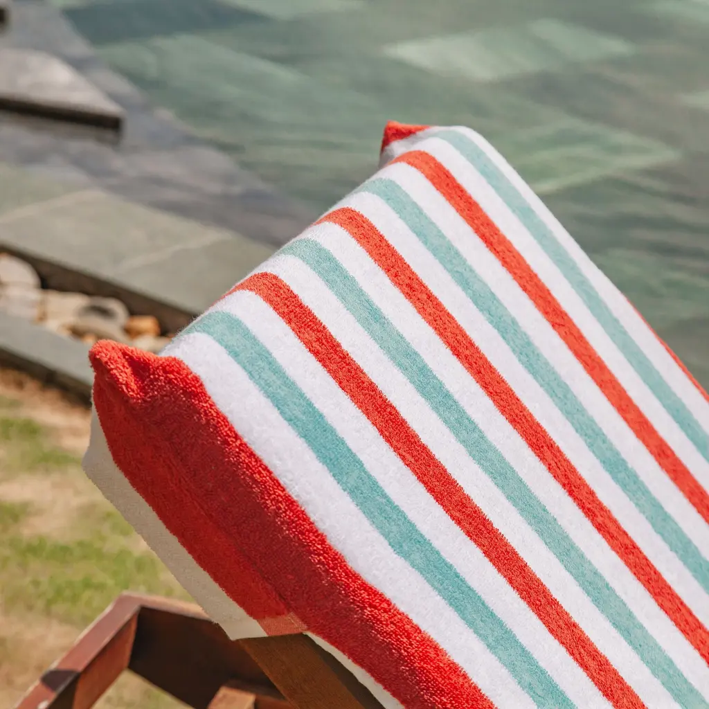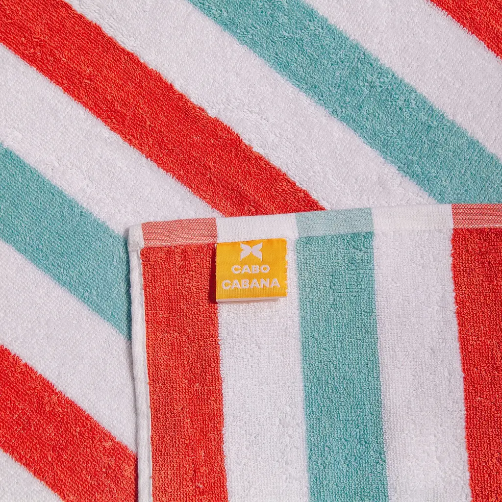 QUALITY TERRY TOWEL: Made from 20Double 100% ring spun cotton, Cabo Cabana beach & pool towels are soft, absorbent, and quick-drying. Our Cabana pool towels are woven with yarn-dyed cotton so will not fade easily. OVERSIZED POOL TOWEL: Generously sized at 30 x 70 inches, this large beach towel features an oversized surface area for drying. Customers also use our pool towels as lounge chair covers and extra-large bath towels. BEACH TOWEL COLORS: Cabo Cabana Towels feature a white base color with alternate colored cabana stripes in seven vibrant color combinations. They make a great bath towel set for your bathroom or guest room.The bright and unique color combinations will make you stand out of the crowd at a beach, pool or resort. MULTIPURPOSE CABANA TOWEL: Originally developed as a hotel pool towel, Our striped cabana beach towel pack make terrific home bath towels, hotel towels, resort beach towels, Airbnb bed and breakfast bath towels, VRBO vacation rental, gym towels, and hotel spa towels.