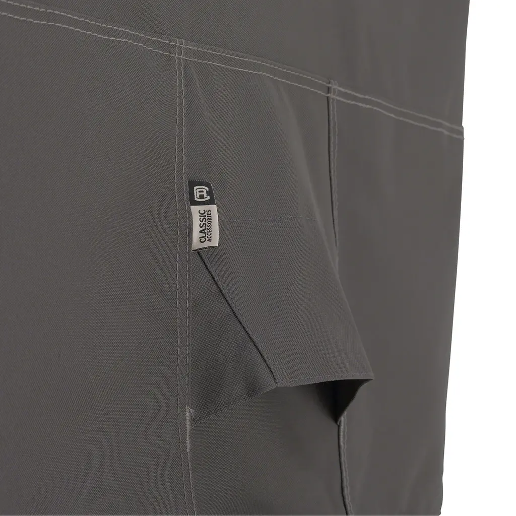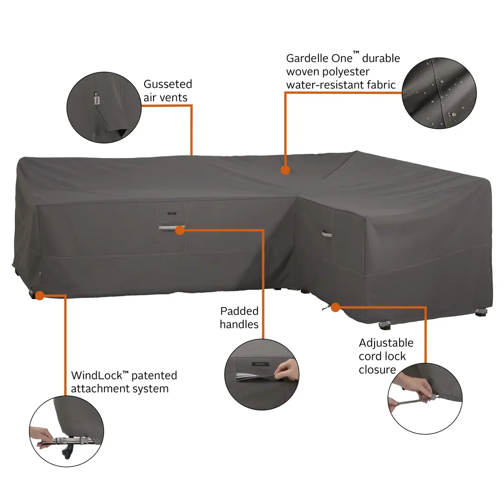 Protect your patio furniture from the elements with the Ravenna Water-Resistant 104 Inch Patio Right Facing Sectional Lounge Set Cover from Classic Accessories. Made with Gardelle One™, a durable woven polyester fabric with an added UV-stabilized coating and a water-resistant laminated undercoating, this cover will keep your furniture safe for years to come. The adjustable WindLock™ secure attachment system ensures a customizable fit with exceptional security, while reinforced padded handles make removal easy. Air vents prevent condensation and provide maximum ventilation. Plus, the Ravenna Collection offers a Two-year limited warranty for added peace of mind.Features:Other section: