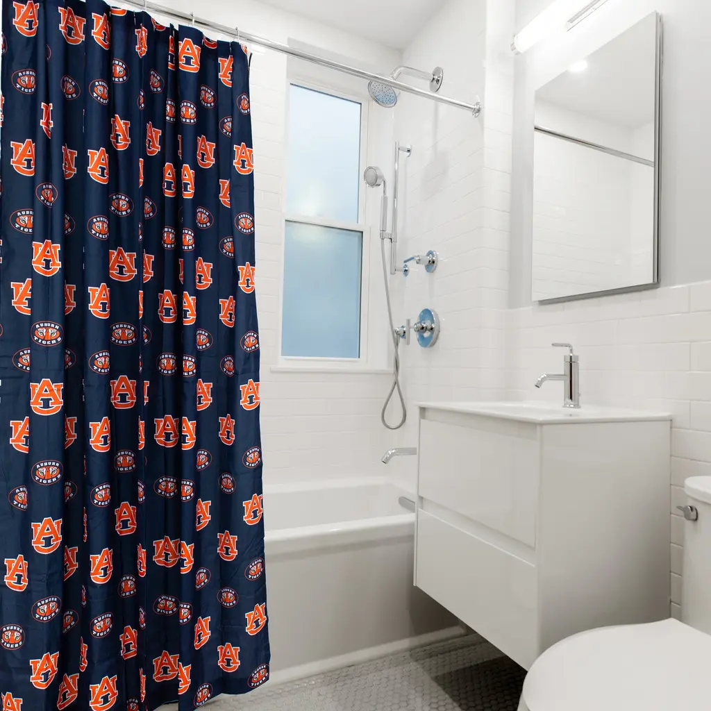 College Covers brand NCAA licensed shower curtain cover can be used either with or without a liner, since its easy to wash. This does not include a plastic liner. The shower curtain measures 70 inches long by 72 inches wide and is printed in an all over pattern with a bright and vibrant team color background. 12 buttonholes across the top make it easy to put up and take down with any style curtain rings (not included). This also matches College Covers brand curtain panels and valances. Machine wash in cold water with like colors and tumble dry on a low heat. Imported. Licensed by Everything Comfy.
