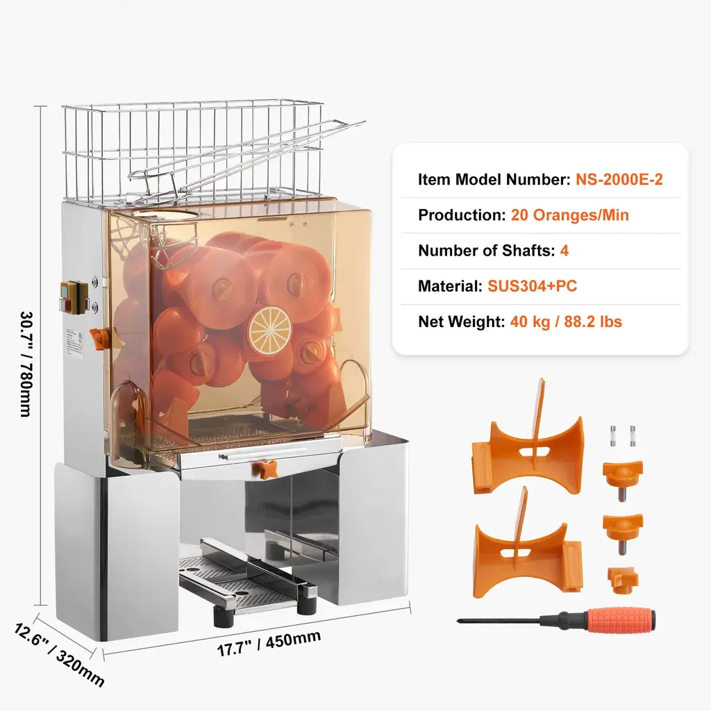 Efficient Squeezing: Our commercial orange juice machine combines automatic peeling, juicing, and filtering. Equipped with a robust 120W motor, the commercial orange juicer can effortlessly extract juice from up to 20/25 oranges per minute. The upgraded concave-convex balls further enhance juice production. Large Feed Chute: With a spacious feed chute that accommodates oranges ranging from 55-80 mm (2.2"-3.2"), this orange juicer machine simplifies the juicing process. Additionally, the top storage basket allows you to store a substantial quantity of pre-washed oranges, reducing the need for frequent preparation. Easy to Clean: Crafted from food-grade SUS304 stainless steel and high-quality PC, our commercial juicer machine ensures the utmost hygiene. Most components are detachable and easy to clean, and the pull-out filter design facilitates thorough cleaning, preserving the pure taste of your juice. Safety Features: The stainless steel protective cover of the automatic feeding juice machine not only adds aesthetic appeal but also houses a pressure sensor that halts operation when the cover is removed. Furthermore, the switch is safeguarded by a waterproof cover, providing comprehensive protection. Versatile Usage: This commercial juice maker machine includes a set of replacement parts for your convenience. It finds applications in a wide range of settings, including grocery stores, restaurants, fruit shops, cantinas, gym clubs, beverage outlets, bars, offices, and more. Package Content 1 x Commercial Orange Juicer 2 x Peeler 2 x Tightening Screws 1 x Four-Point Star Screw 1 x Instruction Manual 1 x Phillips Screwdriver 2 x Fuses