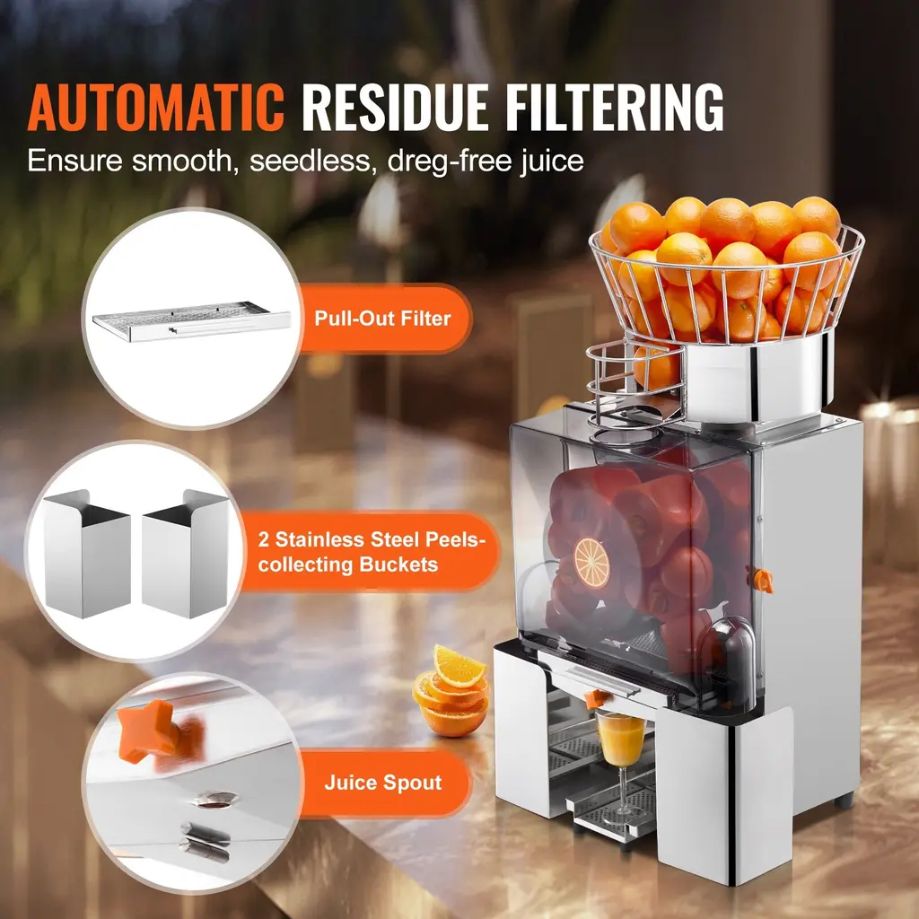 Efficient Squeezing: Our commercial orange juice machine combines automatic peeling, juicing, and filtering. Equipped with a robust 120W motor, the commercial orange juicer can effortlessly extract juice from up to 20/25 oranges per minute. The upgraded concave-convex balls further enhance juice production. Large Feed Chute: With a spacious feed chute that accommodates oranges ranging from 55-80 mm (2.2"-3.2"), this orange juicer machine simplifies the juicing process. Additionally, the top storage basket allows you to store a substantial quantity of pre-washed oranges, reducing the need for frequent preparation. Easy to Clean: Crafted from food-grade SUS304 stainless steel and high-quality PC, our commercial juicer machine ensures the utmost hygiene. Most components are detachable and easy to clean, and the pull-out filter design facilitates thorough cleaning, preserving the pure taste of your juice. Safety Features: The stainless steel protective cover of the automatic feeding juice machine not only adds aesthetic appeal but also houses a pressure sensor that halts operation when the cover is removed. Furthermore, the switch is safeguarded by a waterproof cover, providing comprehensive protection. Versatile Usage: This commercial juice maker machine includes a set of replacement parts for your convenience. It finds applications in a wide range of settings, including grocery stores, restaurants, fruit shops, cantinas, gym clubs, beverage outlets, bars, offices, and more. Package Content 1 x Commercial Orange Juicer 2 x Peeler 2 x Tightening Screws 1 x Four-Point Star Screw 1 x Instruction Manual 1 x Phillips Screwdriver 2 x Fuses