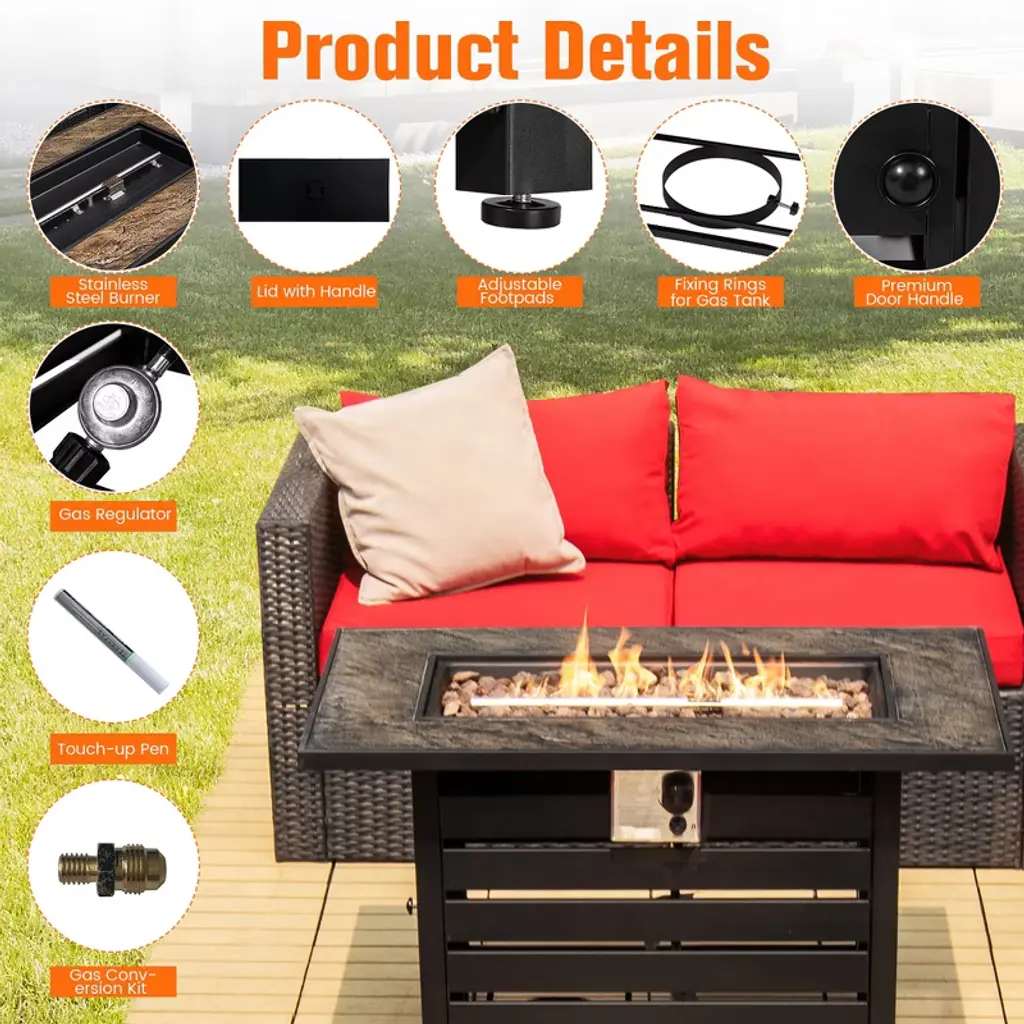 Come to relax with your family or friends sitting around this 42'' propane gas fire pit table. The convenient igniting button and knob allows you to easily ignite and adjust the flame. With 50,000 BTU heat output, you won’t feel cold any more in winter days. Plus, you can also use it as a coffee table by covering the lid. The fire pit table is of high stability thanks to the reinforced steel structure. The ore powder tabletop is heat resistant and sturdy, withstanding the test of time, and the stainless steel burner also ensures long service life. When not using, you can use the PVC cover to protect the fire table from rain and sunlight. Such a functional fire pit table will be a premium choice for you to relax outdoors. Do not hesitate to bring it home!FeaturesPerfect to be a fire pit table or a coffee table 50,000 BTU heat output keeps you away from coldness Easy and safe to ignite and adjust the flame Include lava rocks for added beauty Solid steel structure for high stability Ore powder tabletop and stainless steel burner for high durability Adjustable footpads improve the overall stability PVC cover offers considerate protection to the fire table Detailed instruction helps you finish the assemblyColor: Black Material: Ore Powder, Steel, Stainless Steel, PVC Overall Dimension: 42'' x 24'' x 25'' (L x W x H) Dimension of Lid: 28'' x 12'' (L x W) Weight Capacity of Tabletop: 150 lbs Net Weight: 67 lbs Heat Output: 50,000 BTU Battery Required: 1 x AAA Battery (Not Included) Suitable Gas Tank: 20 lbs Package Includes: 1 x Outdoor Fire Pit 1 x Instant Touch-up Pen 1 x Waterproof Cover 2 x Lava Stone 1 x Gas Conversion Kit 1 x Instruction