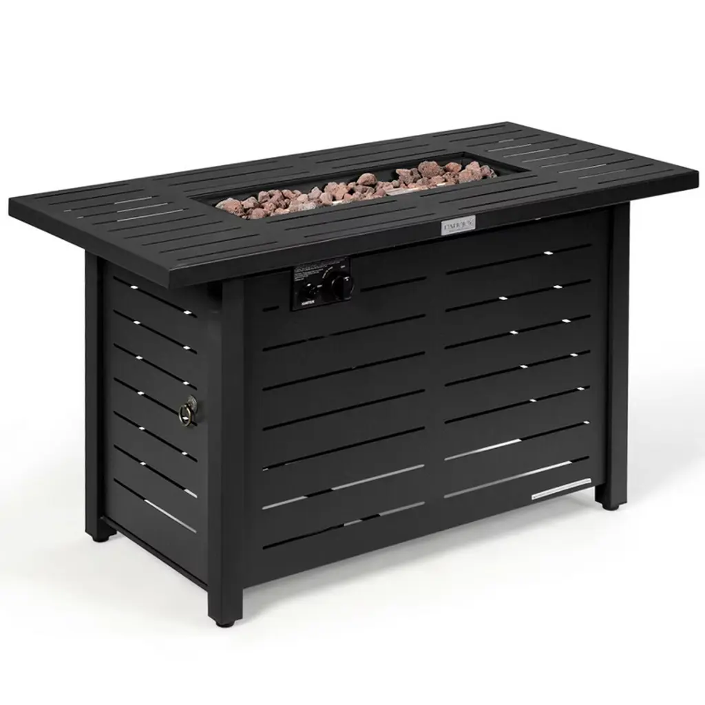 Our 60,000 BTU fire pit is a versatile piece of patio furniture that you'll find yourself using all year round. This outdoor fire table is made of sturdy steel material for durability and stability. Coming with a waterproof PVC cover, the table surface will not easy to be damaged and can stand the test of time. And complete with a high-efficiency burner, you can enjoy all the pleasures of a warm fire without worrying about messy ashes. What's more, the table lid allows you to close the surface top and use it as a normal table. The stylish and simple appearance can perfectly match your garden, courtyard, and terrace. You can have a party or gather with family members even in cold winter evening. Do not hesitate to buy it now!FeaturesDoor with elegant handle and magnetic clasp for hidden inner space CSA certified burner and ETL certified table Sturdy & stable steel material provides strong durability 60,000 BTU heat output offers ample warmth for you in the outdoors Equipped with electronic ignition and in-built control panel Table cover with pull-tab for convenient Adjustable foot pads for added stabiliy Multi-function design which can be used as fire table or coffee table Lava rocks included to beautifully accent the flames Suitable for 20 lbs propane stove Waterproof PVC cover for easy storage Modern and elegant design with hollowed-out design Easy to assembleColor: Black Material: Steel Overall Dimension: 42'' x 20'' x 25'' (L X W X H) Net Weight: 53 lbs Heat Output: 60,000 BTU Package includes: 1 X Outdoor Fire Pit Table 1 X PVC Cover 1 X Instructions