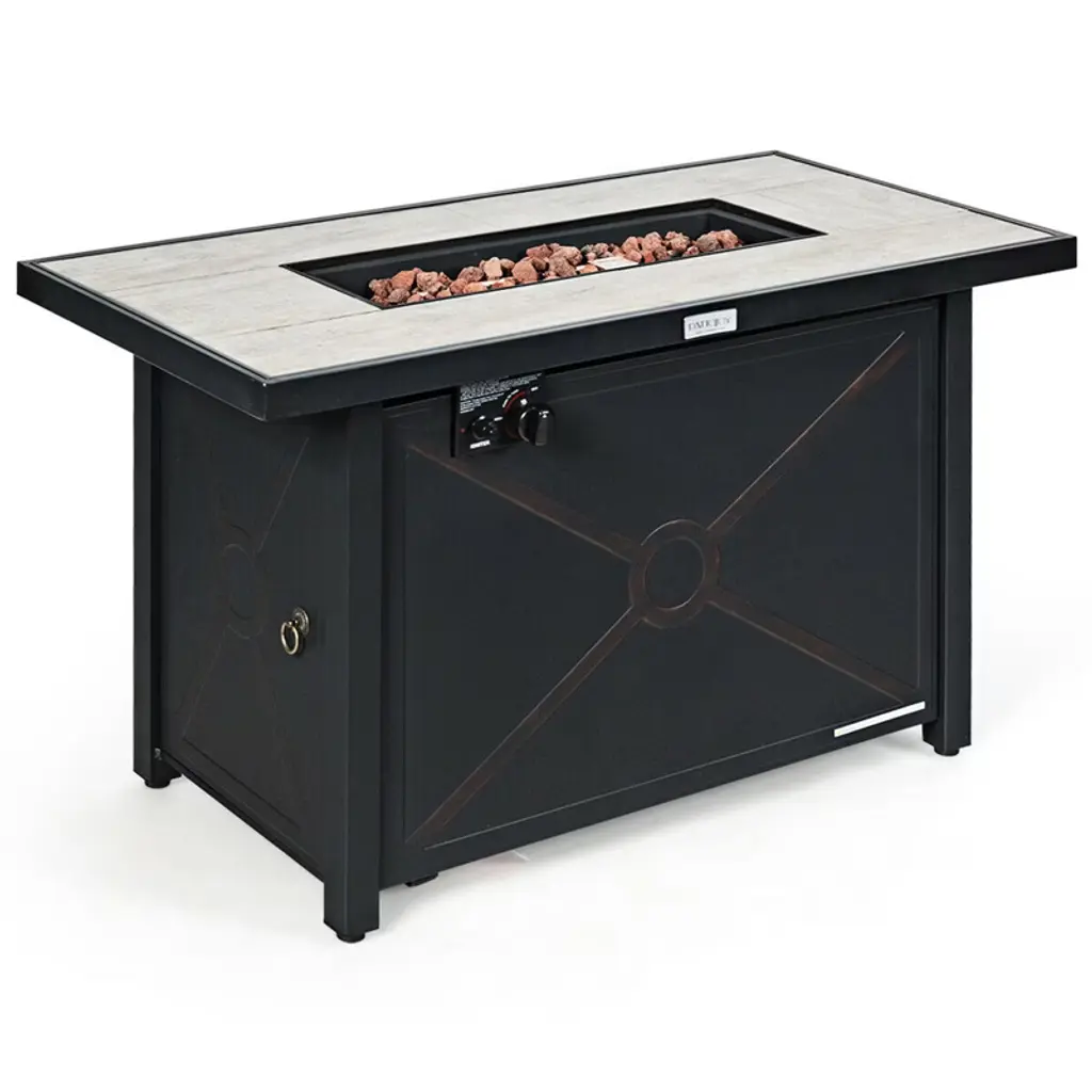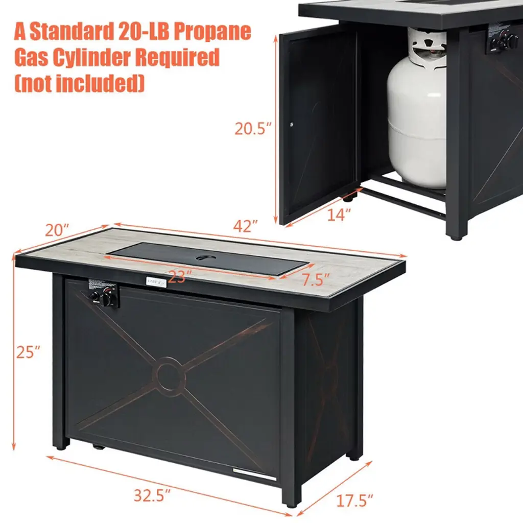 This outdoor fire table is made of sturdy steel material for durability and stability. Adjustable foot pads at the bottom can help to add the stability. Coming with a waterproof PVC cover, the table surface will not easy to be damaged and can stand the test of time. And complete with a high-efficiency burner, you can enjoy all the pleasures of a warm fire without worrying about messy ashes. What's more, the table lid allows you to close the surface top and use it as a normal table. The stylish and simple appearance can perfectly match your garden, courtyard, and terrace. You can have a party or gather with family members even in cold winter evening. Do not hesitate to buy it now!FeaturesDoor with elegant handle and magnetic clasp for hidden inner space Suitable for 20 lbs propane stove Ceramic table top and embossed side panels suitable for outdoor decor Waterproof PVC storage cover for better maintenance CSA certified burner and ETL certified table Constructed with sturdy steel frame for durability and long term use 60,000 BTU heat output offers ample warmth for you in the outdoors Equipped with electronic ignition and in-built control panel Lava rocks included to help disperse the warmth more evenly Adjustable foot pads for added stability Removable table cover with pull-tab for convenient Multi-function design which can be used as fire table or coffee table Easy to assembleColor: Black Material: Steel Overall Dimension: 42'' x 20'' x 25'' (L X W X H) Net Weight: 65.5 lbs Heat Output: 60,000 BTU Package includes: 1 X Outdoor Fire Pit Table 1 X PVC Cover 1 X Instructions