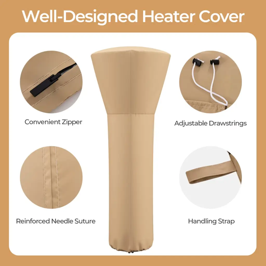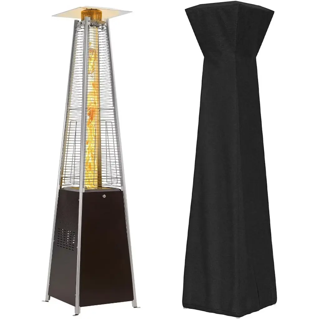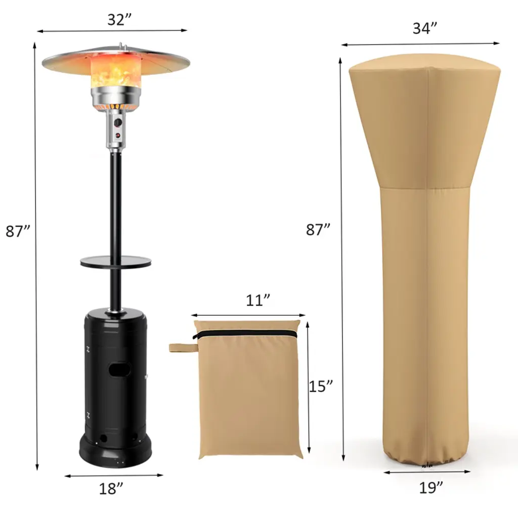 This 87 inches Tall metal patio heater will provides continues warmth for your family in winter. We adopt to high efficiency heating element, which can output 48,000 BTU BTU's of steady warmth. And the top reflector plate can preferably keep heat within a diameter of 13'. Besides, the heater has a extra shelf for you to place some drinks and wines, you can also enjoy leisure time in the patio with your friends or family, even when temperatures begin to dip. We provide a rain cover to protect the patio heater from bad weather and natural damages, please note: rain cover and patio heater are divided into 2 boxes. We ship 2 boxes on same day, but they may arrive on different days. Thanks for your understanding.FeaturesColor: Black / Bronze / Grey / Silver Material: stainless steel Product Size: 32'' x 32'' x 87'' (L x W x H) Base size: Dia.18 x 3.5 inch Cylinder Housing size: 15 x 30 inch Combustion screen size: Dia.11 x 8.5 inch Reflector cover size: Dia.32 inch Desktop diameter: 16 inch Main strut size: 2.5 x 33.5 inch Power: 48000 BTU Combustion capacity: 1 - 2 lbs/h Fuel: 20 lbs Propane cylinder Net Weight: 35 lbs Package includes: 1 x Heater 1 x Shelf 1 x Rain Cover 1 x Instruction