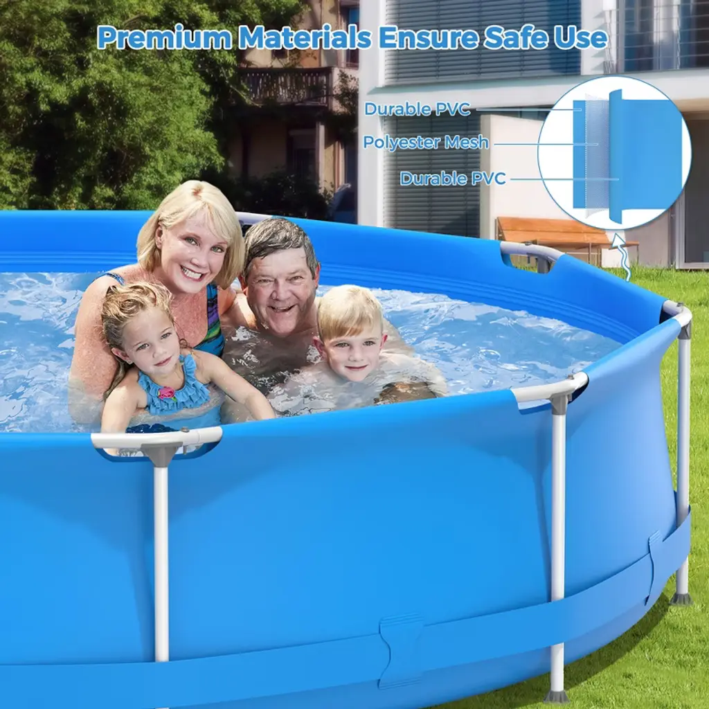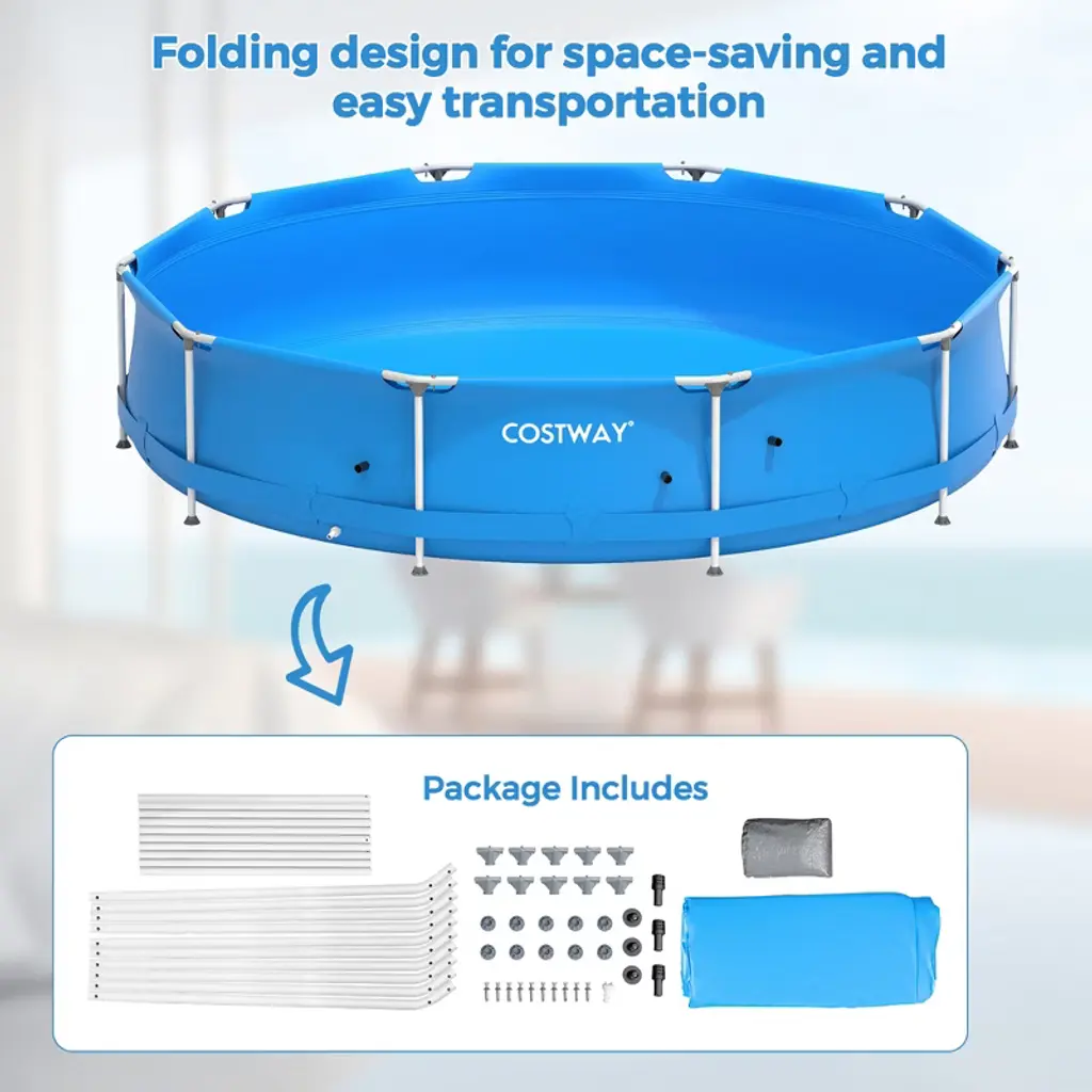 Costway Round Above Ground Swimming Pool Patio Frame Pool W/ Pool Cover Iron Frame Blue