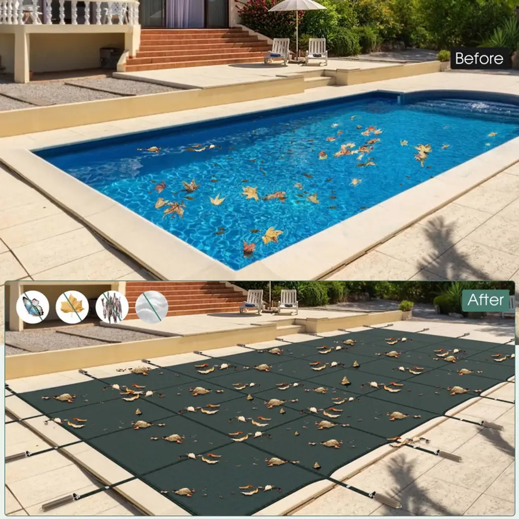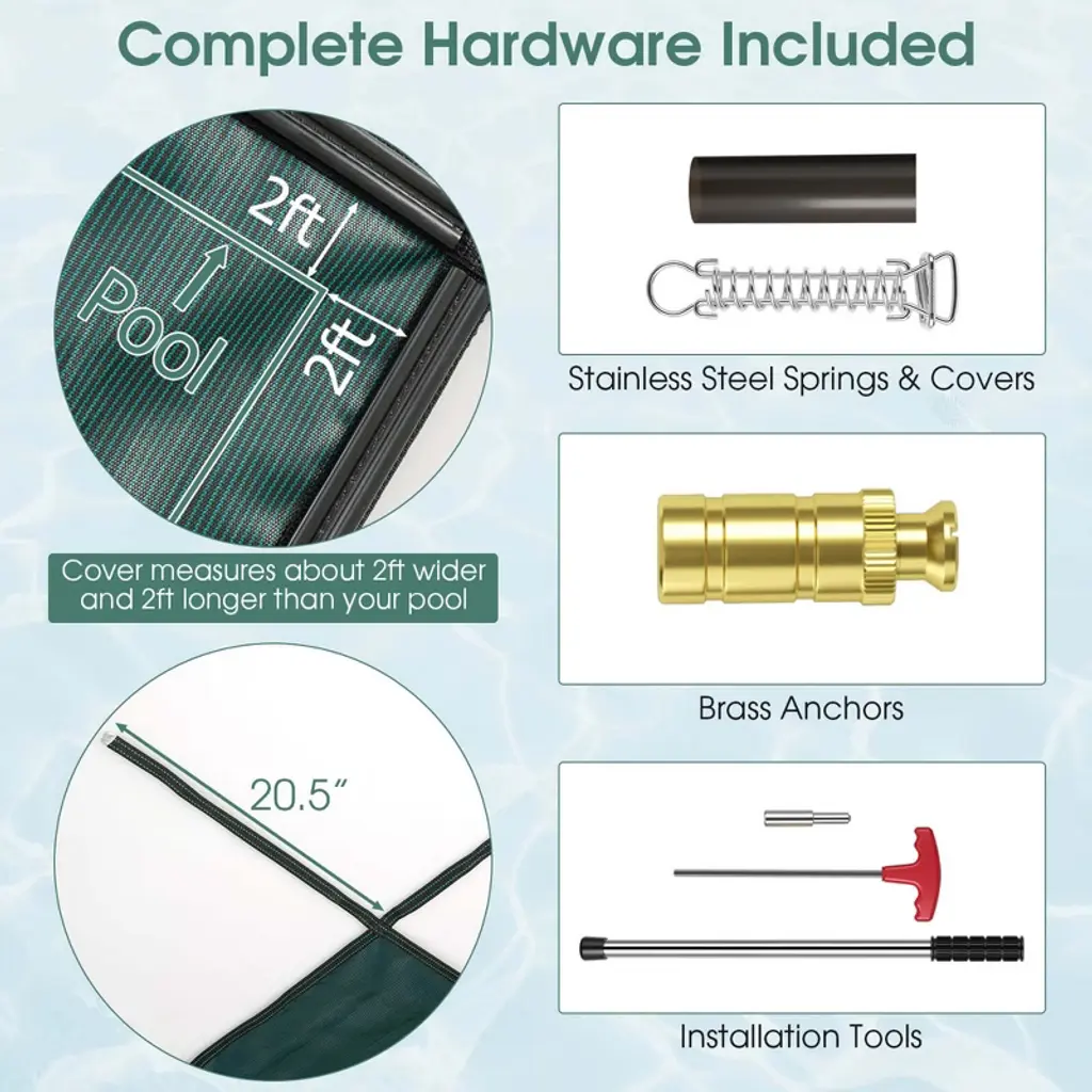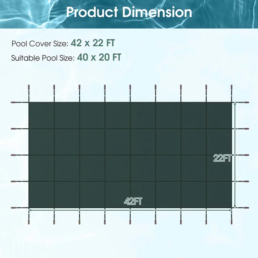 Looking for the perfect pool cover to keep your pool clean and debris-free? Our high-quality premium pool safety cover is the answer! Crafted from sturdy and wear-resistant PP material, this pool cover is built to last. Not only does it keep your pool free from debris, fallen leaves, and snow, but it also helps to reduce evaporation, preserving the water level. Besides, featuring an upgraded mesh design, our pool safety cover allows water to pass through while effectively blocking sunlight and debris. With adjustable straps, our pool cover provides a secure and customized installation. Additionally, the tight stitching and premium springs with protective covers add to its durability and stability.FeaturesHigh quality PP material ensures durability and long-lasting performance High-strength construction guarantees a secure and stable pool cover Reduces evaporation, helping to maintain the water level in your pool Upgraded mesh design allows water to pass through while blocking debris Effectively prevents fallen leaves from entering and dirtying the pool Snow cover feature keeps your pool safe and free from winter weather effects Adjustable straps provide a customizable and secure installation Premium springs with protective covers ensure a sturdy and safe pool coverColor: Blue/Green Material: PP, Metal Overall Dimension: 42 x 22 ft (L x W) Suitable Pool Size:40 x 20 ft (L x W) Net Weight: 47.5 Ibs Weight Capacity: 1000 lbs Package includes: 1 x Folding Pool cover 28 x Stainless Steel Springs 28 x Brass Anchors 28 x Spring Covers 2 x Installation Tools 1 x User Guide