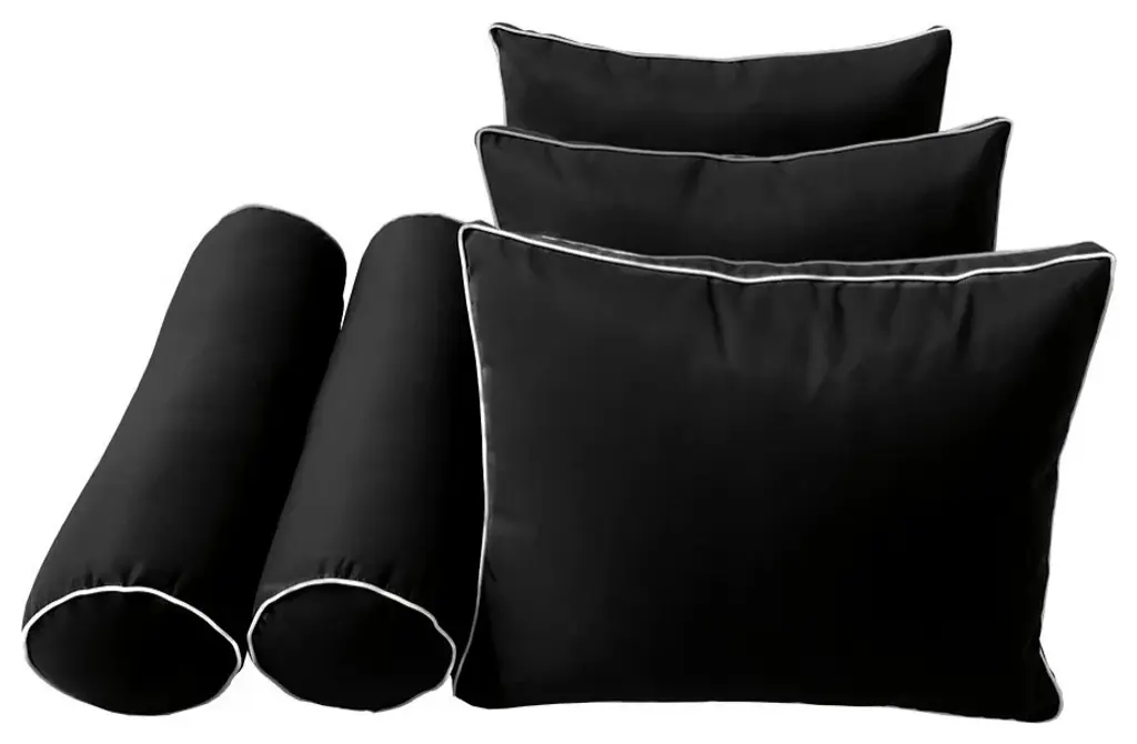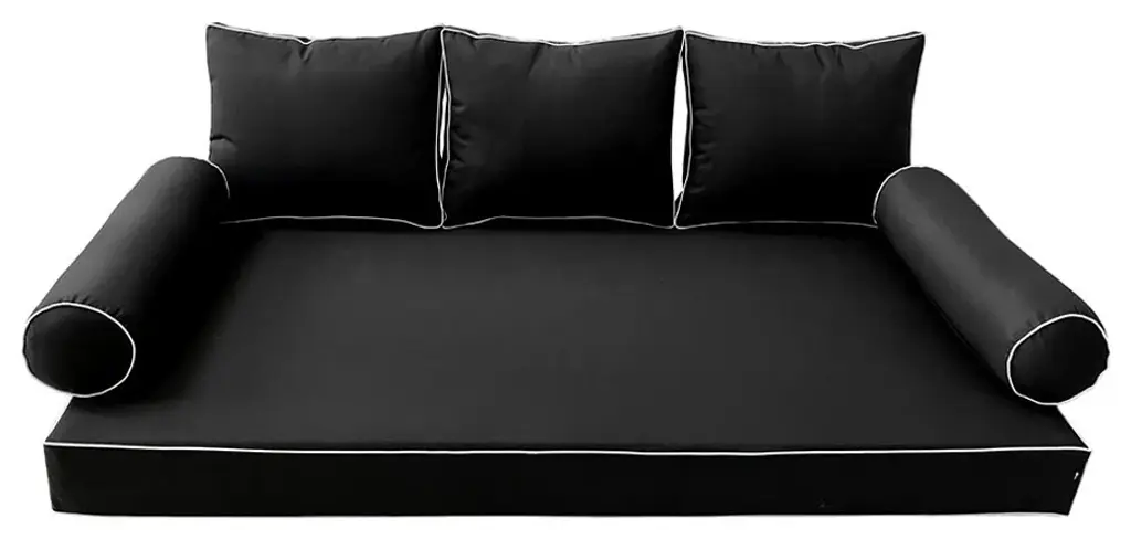 • Style-3 Twin Size 6 PC Contrast Pipe Trim Mattress Bolster Back Cover Only• • Mattress and Insert Not Included• • Fully Encase Cover with Hidden Zipper• 1 x Twin Fitted Sheet Cover Only: 75"x 39" x 6"• 2 x Bolster Pillow Cover Only: 27" x 8"• 3 x Back Pillow Cover Only: 24.5" x 20" x 5"• Color: AD109• Edge Trim: Pipe Trim (contrast color)• Fabric: 230 Gram Polyester Upholstery• Hidden Zipper• Water Repellent • Not Water Proof• • Tips: Please cover or store cushion pillow in rainy season• Cleaning: Soap clean and rinse off with water hose. Outdoor durable!• Quantity: 1