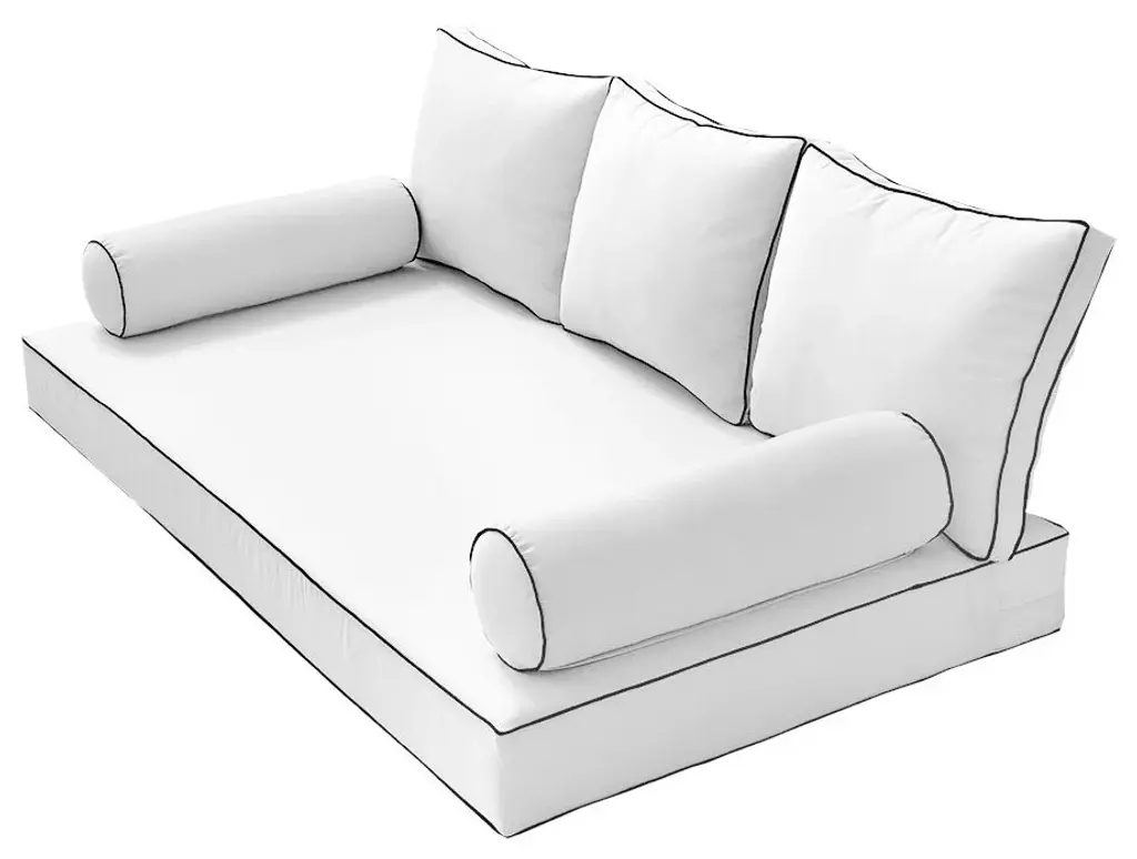 • Style-3 Twin-XL Size 6 PC Contrast Pipe Trim Mattress Bolster Back Cover Only• • Mattress and Insert Not Included• • Fully Encase Cover with Hidden Zipper• 1 x Twin-XL Fitted Sheet Cover Only: 80"x 39" x 6"• 2 x Bolster Pillow Cover Only: 27" x 8"• 3 x Back Pillow Cover Only: 24.5" x 20" x 5"• Color: AD106• Edge Trim: Piped Edge (contrast color)• Fabric: 230 Gram Polyester Upholstery• Hidden Zipper• Water Repellent • Not Water Proof• • Tips: Please cover or store cushion pillow in rainy season• Cleaning: Soap clean and rinse off with water hose. Outdoor durable!• Quantity: 1