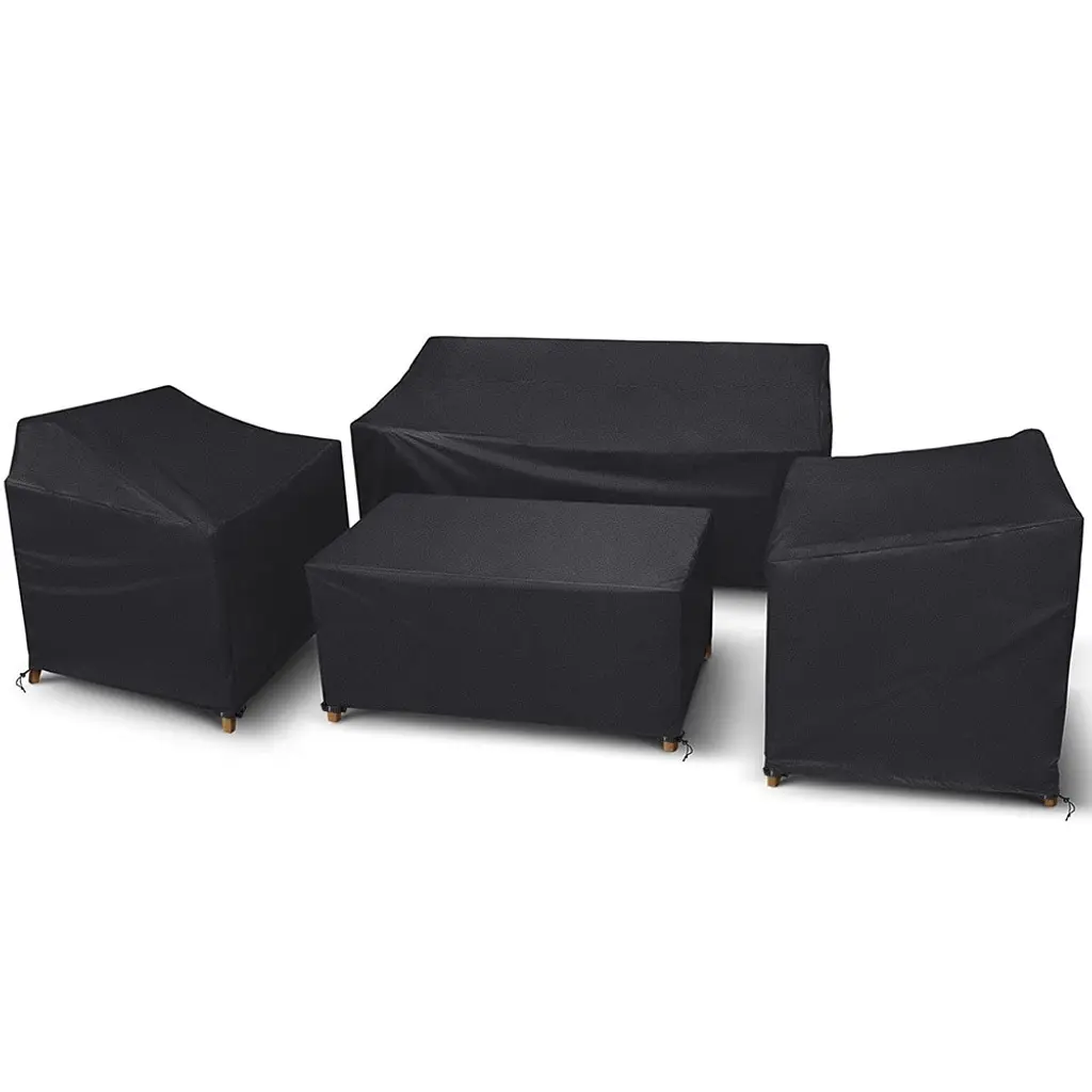 Give your outdoor sectional set shelter with this 4pc custom-fitted protective outdoor cover set. Sewn from polyester reinforced with heavy-duty vinyl, these covers are ready to face the elements, including snow, dirt, sap, rain, and more. Tighten the sewn-in drawstrings and maintain your outdoor sectional set's beauty no matter the season. Designed to fit a variety of outdoor sofas, patio loveseats, square coffee tables, ottomans, outdoor rocking chairs, and patio chairs.